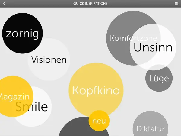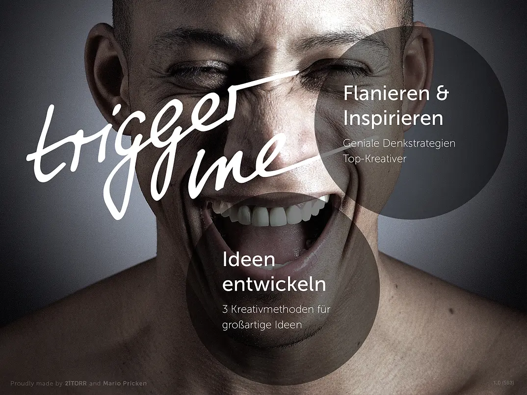 Darüber hinaus gibt es seit kurzem eine iPad App mit dem Namen TriggerMe, die an den Erfolg der beiden Bücher anschließt und zusammen mit 21Torr entwickelt wurde. Auch darin werden Anregungen gegeben, verschiedene Kreativmethoden vorgestellt und Impulse gegeben wie Ideen für »Kribbeln im Kopf« sorgen. Alle Denkstrategien und Kreativmethoden sind mit realen Beispielen aus der (Werbe-) Praxis hinterlegt, so dass jeder Punkt auch direkt verständlich illustriert ist und die Denkmuster verstehen lässt.