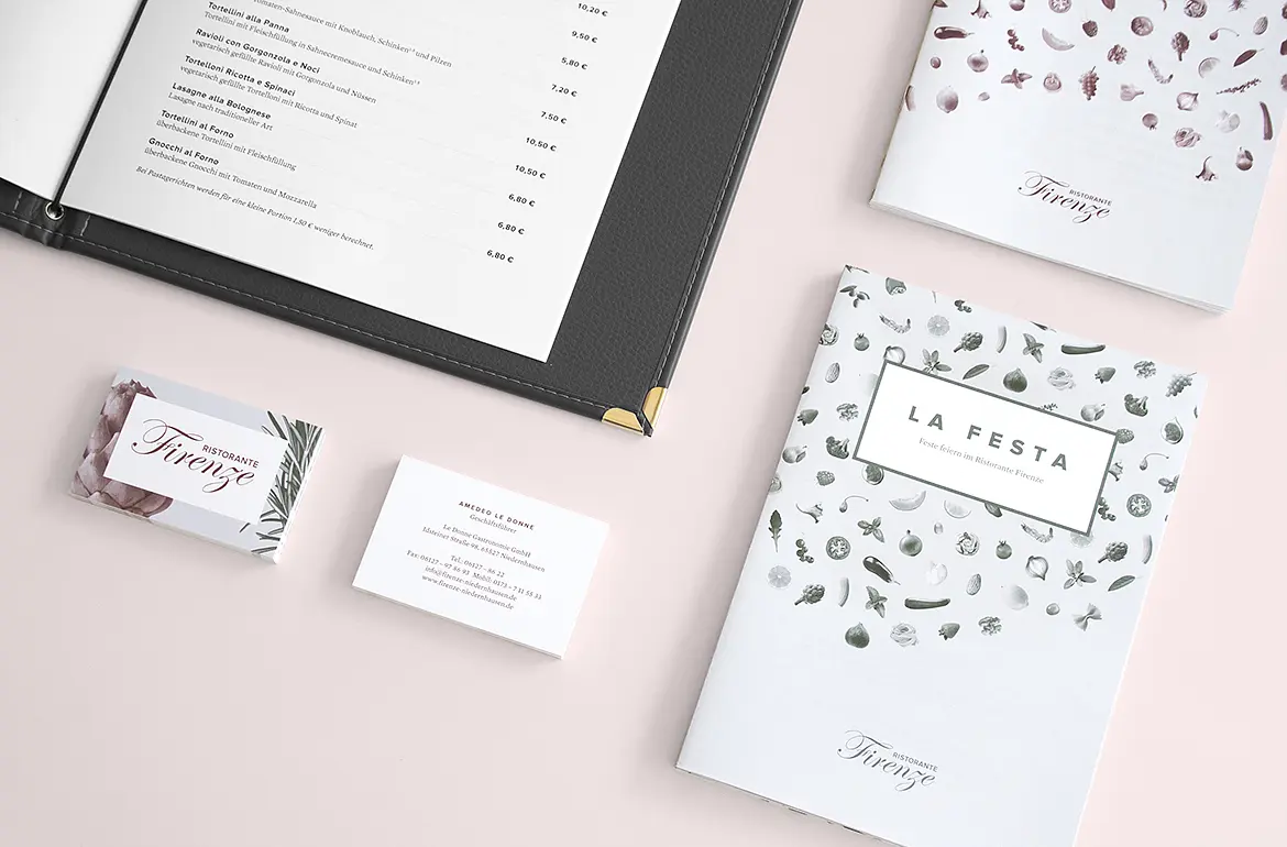 Seit 1974 ist das Firenze ein traditionelles italienisches Restaurant in der Nähe von Frankfurt. Neben einem Refresh des bereits existierenden Logos, sollte ein völlig neues Gestaltungskonzept entwickelt werden. Es entstanden Menü- und Weinkarten, Gutscheine, Flyer, Visitenkarten und Briefpapier. Der Fokus wurde dabei auf die frischen Produkte gelegt, für die das Restaurant bekannt ist. Außerdem wurden die klassischen italienischen Farben auf moderne Weise neu interpretiert.