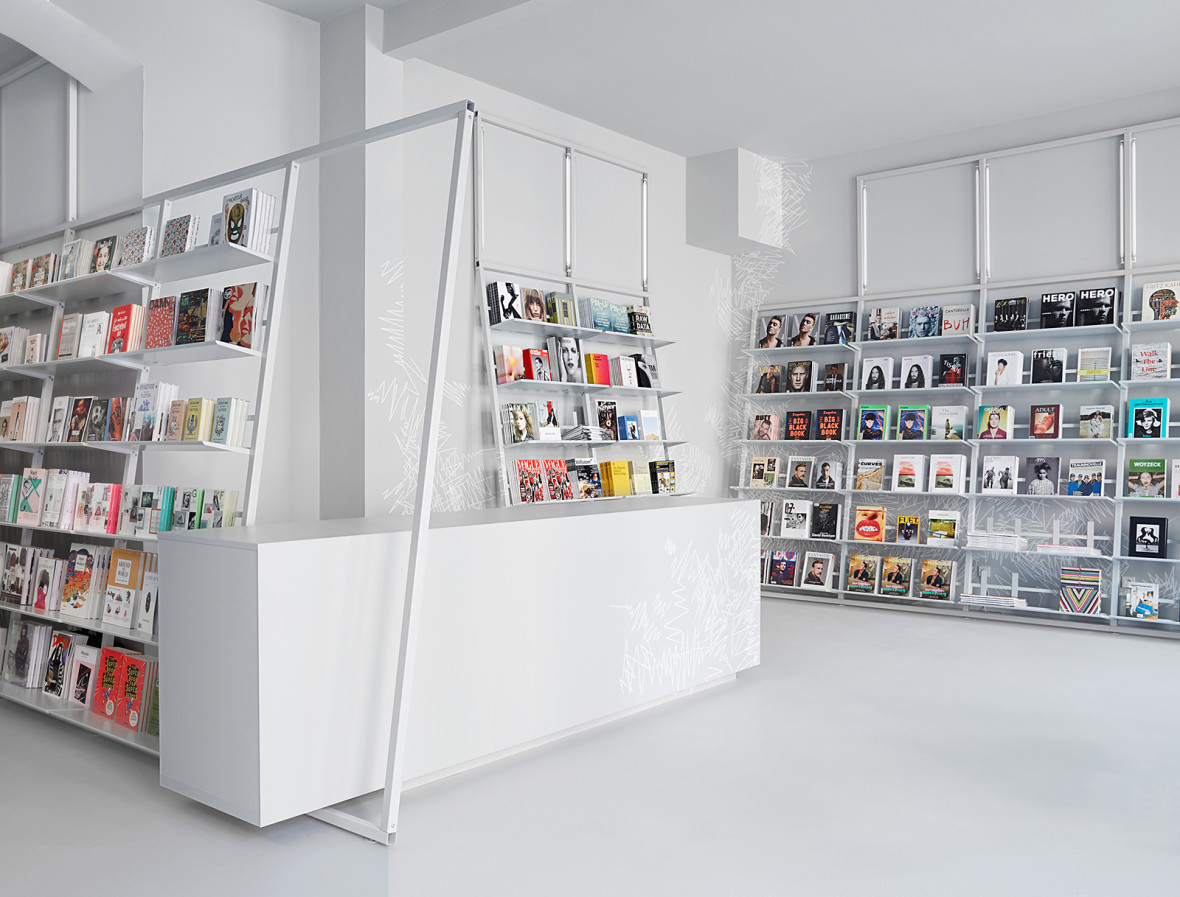 Raum und Inventar sind in eine einheitliche Farboberfläche in RAL 7035 Lichtgrau getaucht. Sämtliche Materialien, von Boden und Decke über Regale bis hin zur Wand, erscheinen in der gleichen Anmutung – Raum und Objekt verschmelzen so zu einer Einheit. Das partiell auf Wand, Regal, Decke und Boden aufgebrachte abstrakte Muster verstärkt diesen Effekt. Trotz seiner grafischen Ausprägung wirkt das „Gekritzel“ willkürlich und nimmt den Flächen ihre Bedeutsamkeit. Lineare Überschneidungen auf losen und festen Elementen egalisieren die Differenz zwischen Raum und Möbel – die verschiedenen Ebenen verschwimmen zu einer diffusen Einheit. Kontrastierend zum minimalistischen Off des Hintergrundes stechen die Produktcover leuchtend in den Vordergrund.