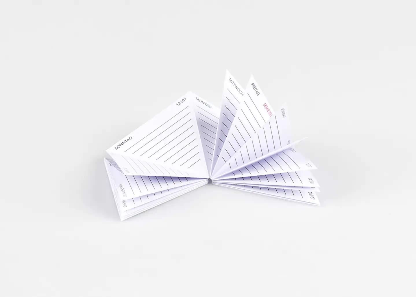 Ein Kalendarium fasst hier die Tage eines Monats zusammen. Ein Tag wird dabei immer auf einer Seite wiedergegeben und lässt somit ausreichend Platz für Notizen. Die einzelnen dreieckigen Hefte heben sich optisch durch verschiedenfarbige Hintergründe auf den Titelseiten voneinander ab, sowie entsprechend unterschiedliche Strukturen auf den Rückseiten der Hefte.