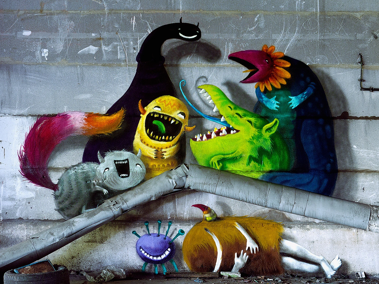 Wie schon bei 99rooms.com bildet bei Monzter die Kombination aus Malerei und dem Raum einer verlassenen Fabrik den Mittelpunkt. Dabei wird eine fiktive Welt in ein reales Umfeld transferiert und es entsteht ein Bild, das auf den ersten Blick durch starke Kontraste geprägt ist. Die malerische Komposition bringt jedoch letztendlich alle Elemente eines Bildes in ein harmonisches Verhältnis zueinander und es entsteht eine Symbiose aus Realität und Fiktion.