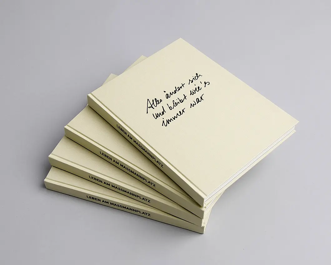 In dem Buch “Leben am Massmannplatz – Alles ändert sich und bleibt wie’s immer war” wird mit einer lockeren Bildsprache und klassisch reduziert moderner Typografie die Welt vieler Studentengenerationen innerhalb dieses Wohnprojekts dargestellt. Der Aufbau folgt in fünf Kapiteln, welche durch das Verwenden von unterschiedlicher Papierstärke haptisch sowie visuell getrennt werden.