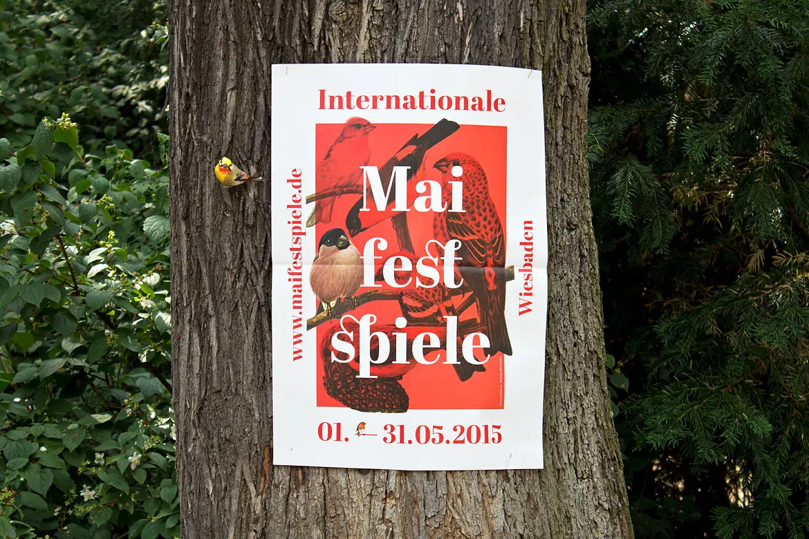 »Die Welt zu Gast in Wiesbaden« ist das traditionelle Motto in der kaiserlichen Kurstadt. Das jährliche Theaterfestival Maifestspiele lädt Produktionen aus den Bereichen Oper, Schauspiel, Tanz und Performace aus der ganzen Welt ein zu einem ganz besonderen Festival-Monat nach Wiesbaden. Die Vögel sind Boten für Frühling, Performance und das Zusammenkommen aus aller Welt.