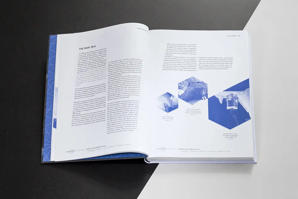 »Beyond the Face« ist ein Interviewband, der die weltbesten Athleten des Klettersports portraitiert. Er erzählt auf Text- und Bildebene Geschichten aus dem Sport und zeigt die Menschen, die ihn prägen. Als Gestaltungskonzept haben wir uns für die Schräge entschieden – sie bringt die komplexen Inhalte in eine Form. Zusammen mit typographischen Feinheiten und einer außergewöhnlichen Bildwelt wurde so eine unverwechselbare Gestaltung geschaffen.