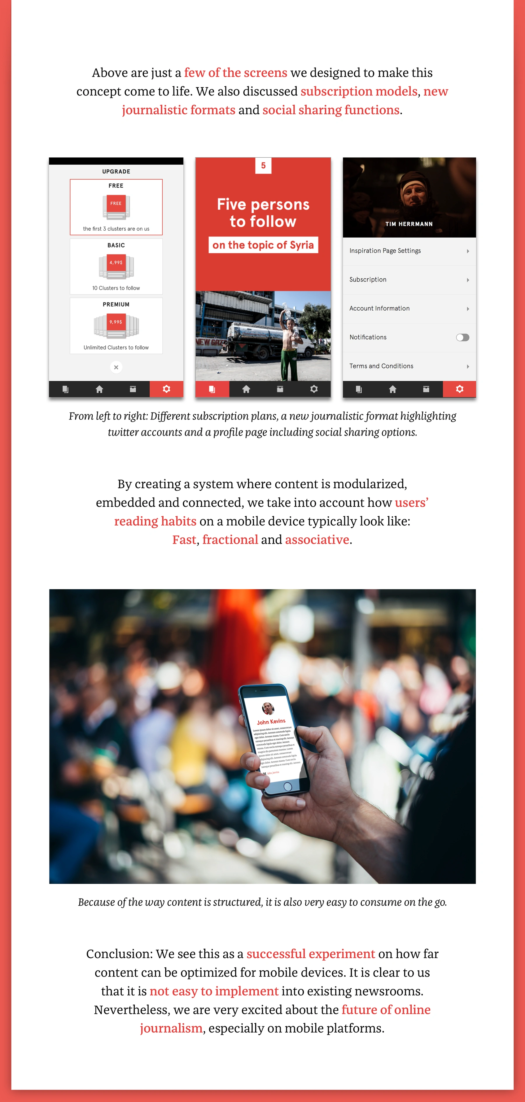 More and more people skip newspapers in favor for their mobile devices, however complex stories are often hard to read and even harder to follow on mobile. In the course „Publishing Perspectives“ in the University of Applied Sciences Berlin (HTW) we figured out a way to make content easier to read and understand.