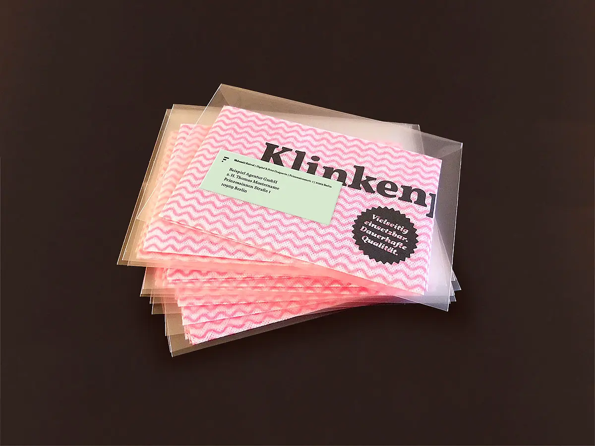 Zweistufiges Vorstellungsmailing als Freelancerin: Eine Klassik- Edition und eine Weihnachts-Edition. Das Mailing wurde im Siebdruck auf echte Putztücher gedruckt.