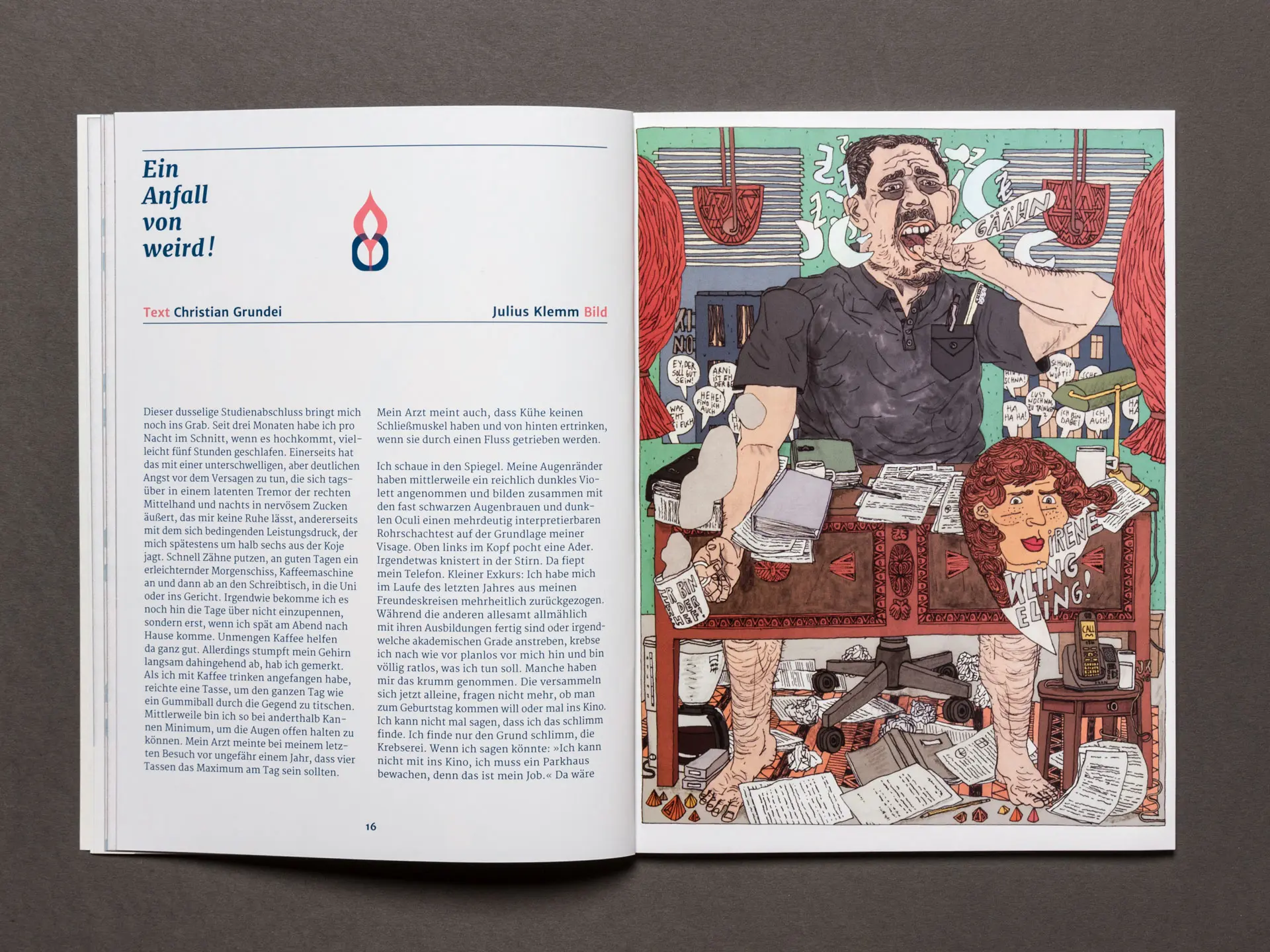 Es gibt zwei Ausschreibungen. Zuerst für die Autor/innen, die zu einem bestimmten Thema (in diesem Fall »Schlaf«) einen Text verfassen. Die einzige Vorgabe ist eine Zeichenbeschränkung. Form und Stil sind völlig frei gestellt. Wenn alle Texte geschrieben und ausgewählt sind, ordnen wir sie den Illustrator/innen zu, die sie dann bebildern. Auch hier geben wir nur die Größe des fertigen Bildes vor.