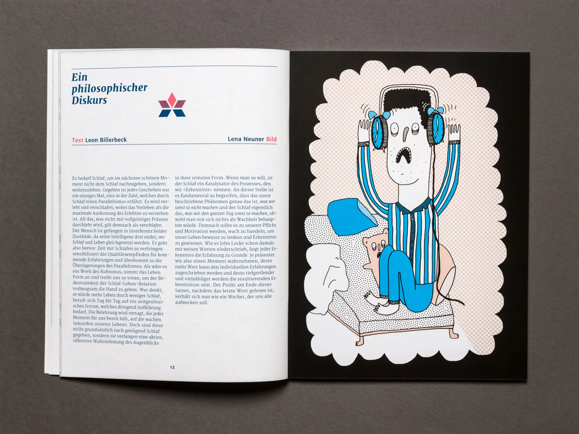 In dieser Publikation gewähren jeweils 19 junge Autoren und Illustratoren Einblick in ihre Gedanken zum Thema Schlaf. Gleichwertig positioniert bilden Text und Bild in ihren unterschiedlichen Formen eine ehrliche, kritische und unterhaltsame Lektüre. Die Gestaltung des Hefts unterstreicht dieses Gleichgewicht und wurde von Motels der 50er und 60er Jahre inspiriert.