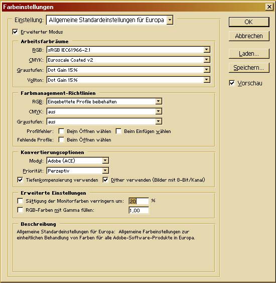 Ich hab auch schon die Farbeinstellungen im Photoshop überprüft und verwende die Standarteinstellungen für Europa. Aber auch wenn ich hier was ändere, ändert das leider nichts an meine Problem.