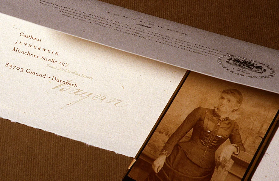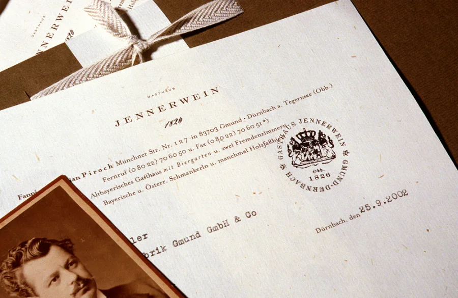 Florian Kohler, Inhaber der Büttenpapierfabrik Gmund, beauftragte den Grafikdesigner Wolfgang Beinert, ein visuelles Erscheinungsbild für sein kürzlich erworbenes Gasthaus »Jennerwein« in Dürnbach am Tegernsee zu gestalten. Kohler renovierte das Gasthaus aus dem Jahre 1826 mit sehr viel Feingefühl nach historischen Vorlagen aus dem 19. Jahrhundert und ließ es von einer Innenarchitektin dementsprechend einrichten.