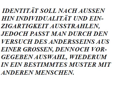 Man wird heute mit einer immer größeren Anzahl von Identifikationsmustern konfrontiert. Menschen stehen nicht mehr nur einem Lebensweg, der ihnen stabile Traditionen, Werte und Normen anbietet, gegenüber, wie das wohl noch zwei Generationen vorher der Fall war. Heute können sie aus vielerlei Identitäts-varianten wählen und sich ihren eigenen “Identitätsmix” zusammen-stellen – ähnlich dem Prozess des Einkaufens – dort hat man heutzutage auch die Wahl zwischen tausenden von Produkten und Artikeln. Man bekommt von einem Produkt nicht nur eine Marke, sondern unzählige, einen Überfluss an Marken vorgesetzt, zwischen denen man sich entscheiden muss. Jedes Produkt wirbt mit unterschiedlichen Vorzügen (= Supermarkt der postmodernen Lebensstile).