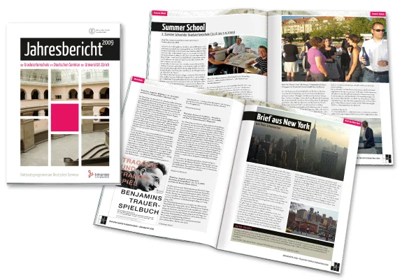 Für das Deutsche Seminar der Universität Zürich ist dieses Layout des Jahresberichts 2009 in Zusammenarbeit mit Bürgie llustration & Grafik enstanden. Die Form auf der Coverseite ist aus einer für das Seminargebäude typischen Fensterfront entstanden.