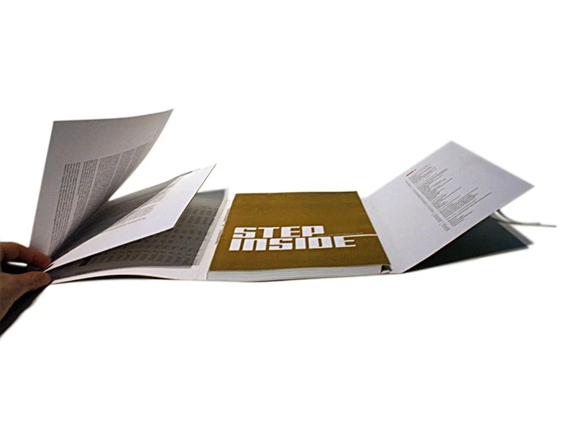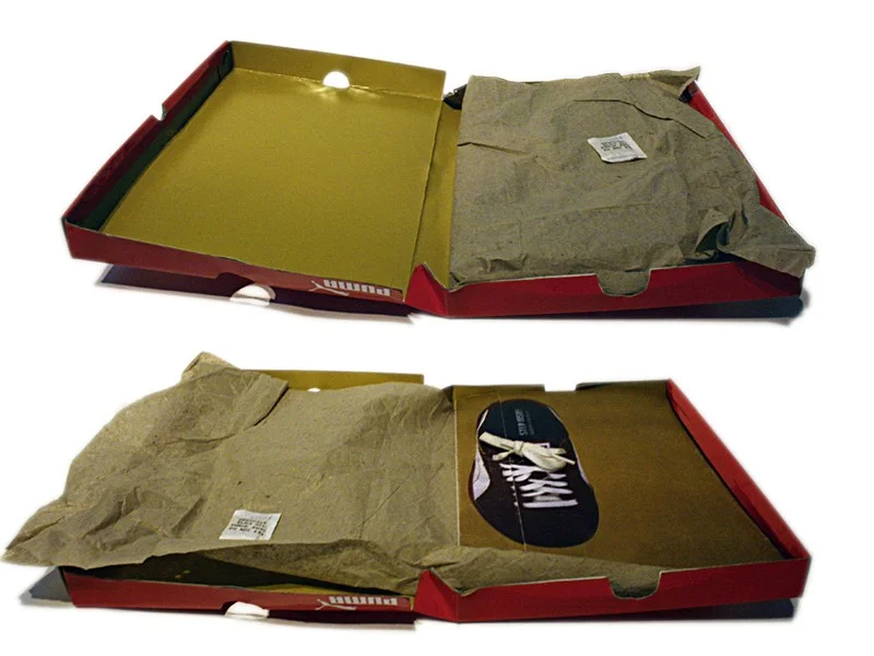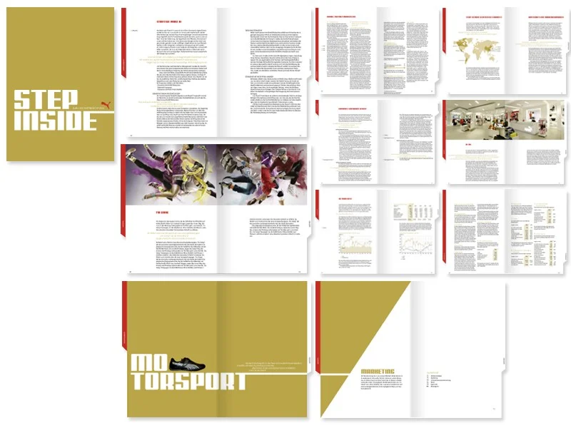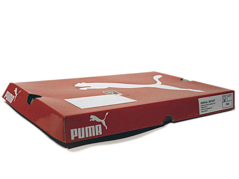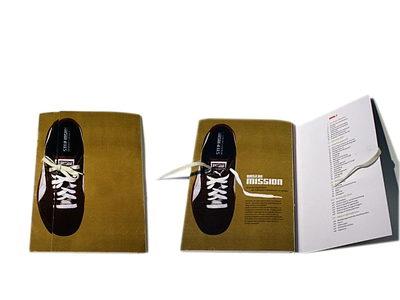 Der neue Geschäftsbericht kommt per Post in einem PUMA Schuhkarton nach Hause. Beim öffnen sieht man als erstes das Schuhkartonpapier indem der Geschäftsbericht namens “Step inside” gewickelt ist. Auf dem Cover des Berichts befindet sich das Bild eines Schuhes. Durch aufschnüren der Schnürsenkel, die in das Bild eingebunden sind, öffnet man den Bericht.