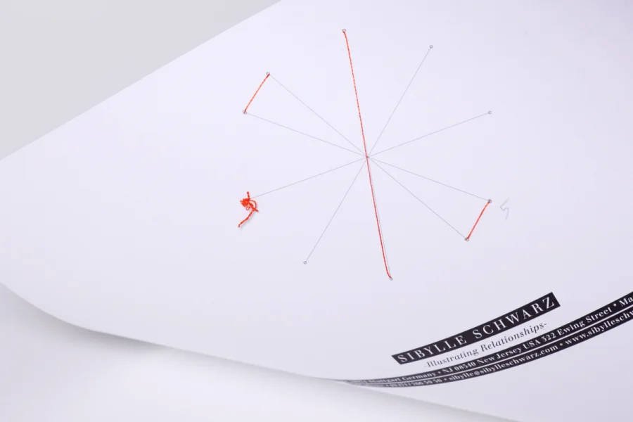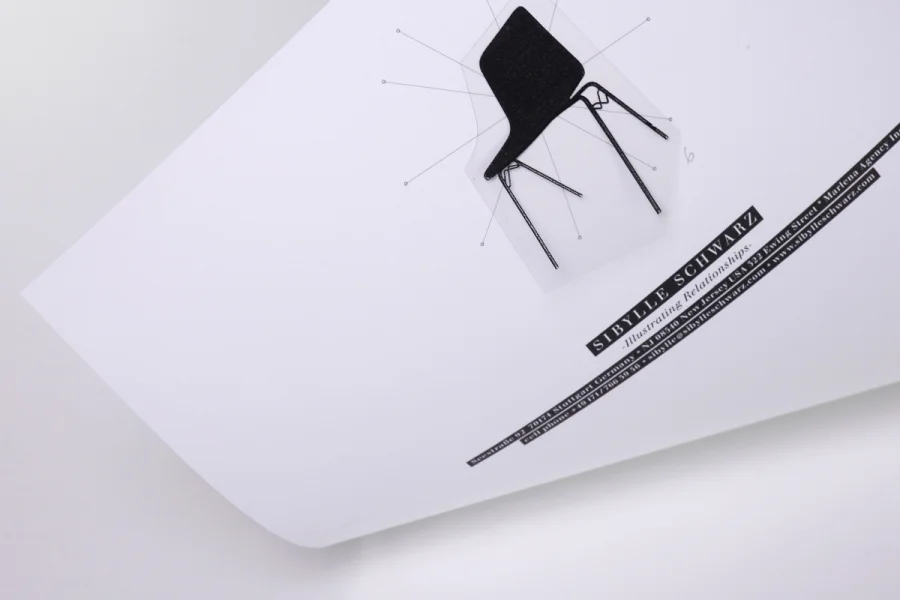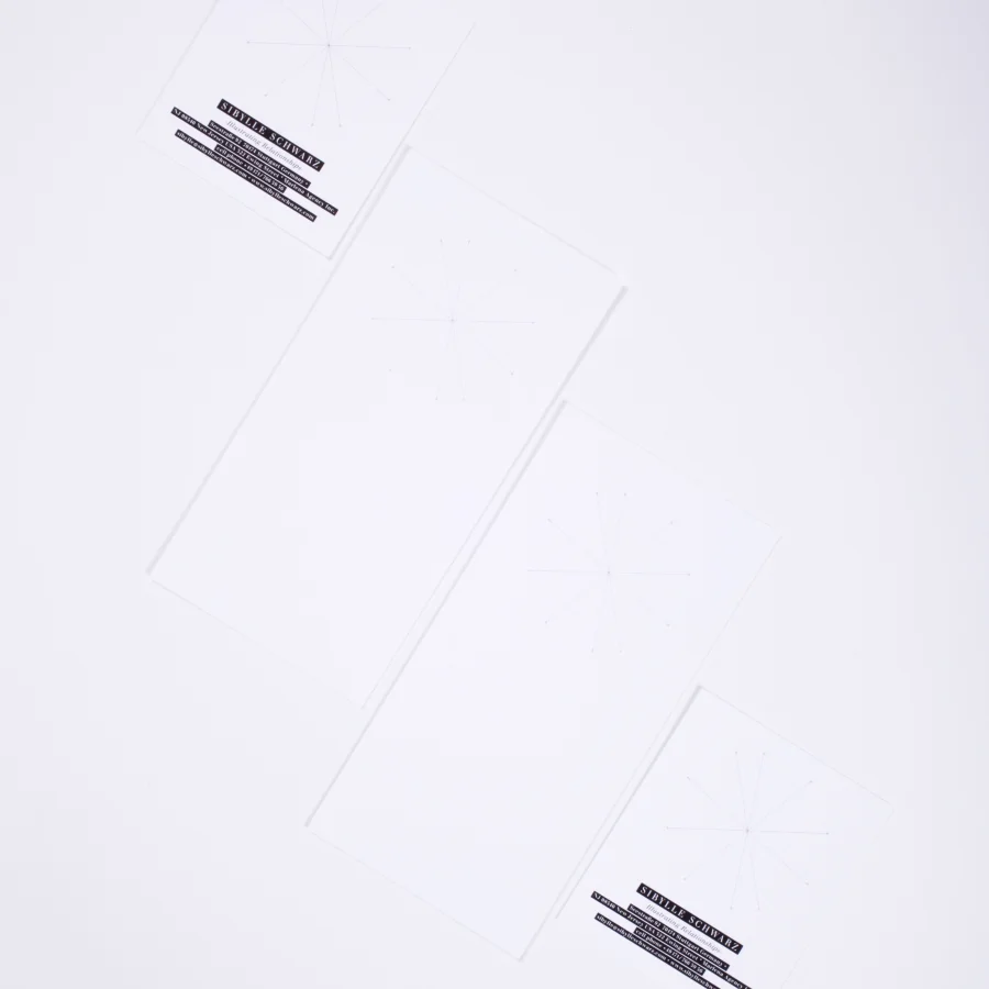 Ihre Arbeit und Persönlichkeit sind stark. So stark, das es eine große Herausforderung war eine visuelle Identität und die damit verbundenen Geschäftspapiere zu gestalten. Die Lösung Ihre filigrane, hochsensible und überragend ästhetischen Arbeiten eine Grundlage zu geben wurde als “grafischer Raum” mit abgesetzter Information gelöst. Die negative Typografie, in grafischen Bändern verpackt, wurde ruhendes Element und prägte sich abseits in passender visueller Erscheinung. Für Sibylle Schwarz wurde kein Logo entwickelt, keine Wortmarke, kein gezeichnetes Symbol. Stattdessen übergaben wir ihr ein einfach zu personalisierendes aus Linien gezeichnetes dreidimensionales filigranes Element. Dieses Element ist Ort, Platz, Raum und Träger für Farbe, Linie, Collage, Bild, Wort und Tat – für eine persönliche Note. Es gab und gibt kein Logozeichen. Und genau dadurch wird ihre Identität besonders sichtbar. Jede Visitenkarte, jeder Briefbogen reagiert auf Alltäglichkeit, Stimmung und Kontext. Keine feste Form, kein Konsenz, sondern eine aktiv wandelnde, persönliche und veränderbare: »Sybille Schwarz – Illustrating Relationships«.
