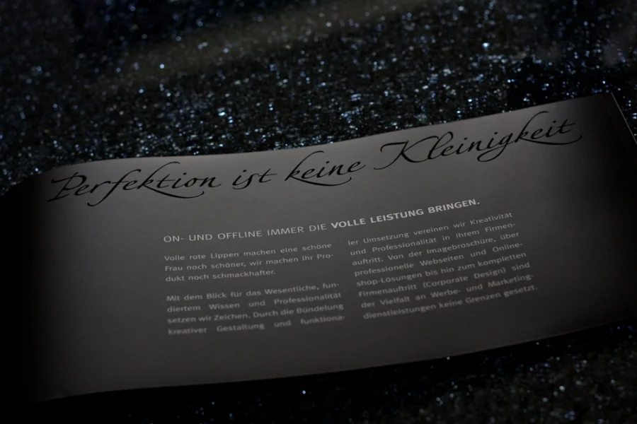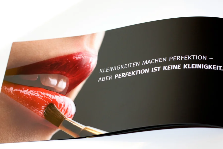 Dabei wurde minimalistisches und klares Design mit ausdrucksstarken Bildern aus dem Bereich “Glitzer und Glamour” kombiniert. Die klare Typografie wird durch matt cellophanierte Seiten und partielle UV-Lackierung hervorgehoben.