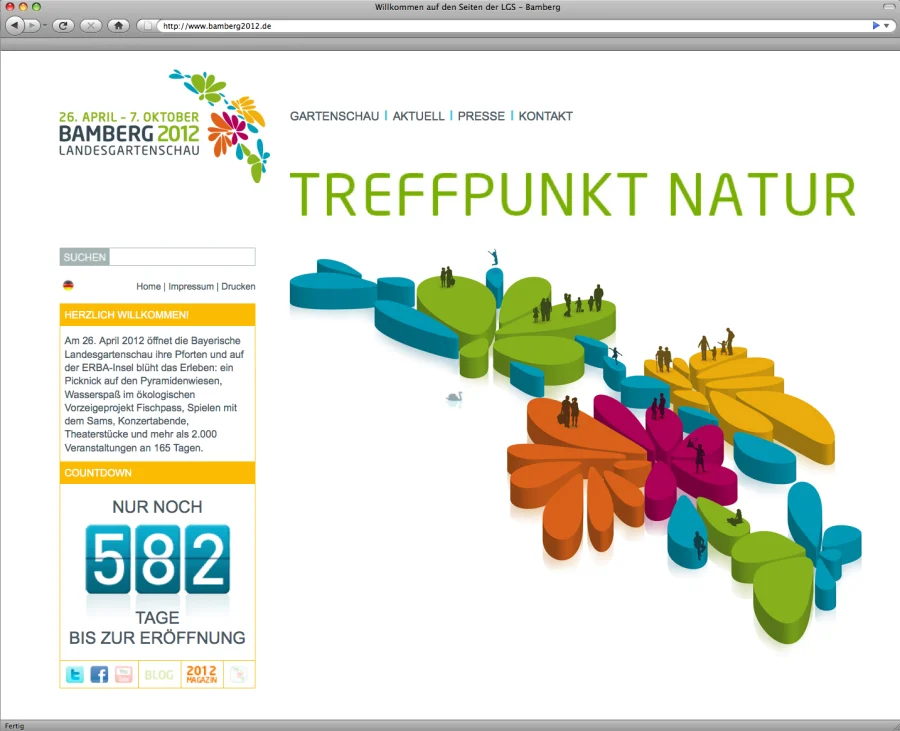 propella verantwortet die gesamte Konzeption und Gestaltung für die Landesgartenschau Bamberg GmbH. Der Internetauftritt ist kürzlich im neu konzipierten Layout gestartet. Bamberg beginnt zu „blühen“. Eröffnet wird die Bayerische Landesgartenschau am 26. April 2012. Es werden rund 1.000 000 Besucher erwartet. Besondere Highlights sind das ökologisches Vorzeigeprojekt Fischpass, Wasserspiele, Pyramidenwiesen, Konzertabende, Theaterstücke und mehr als 2.000 Veranstaltungen an 165 Tagen.