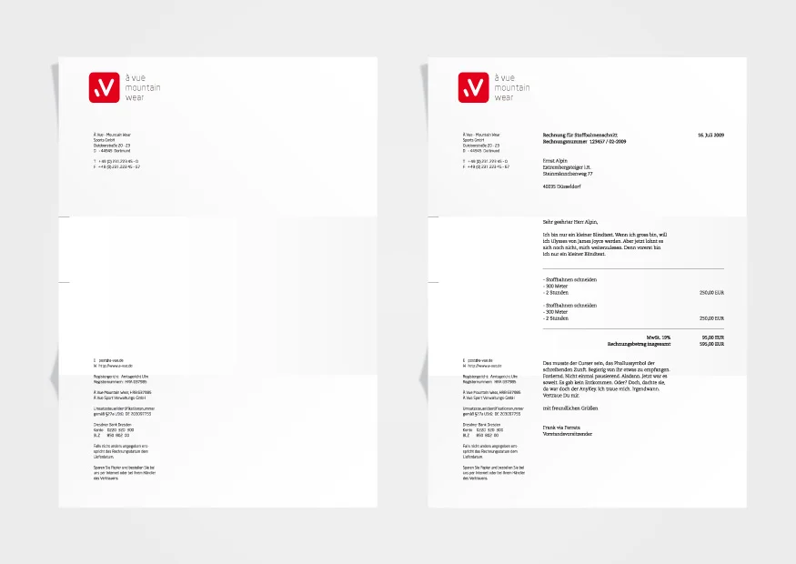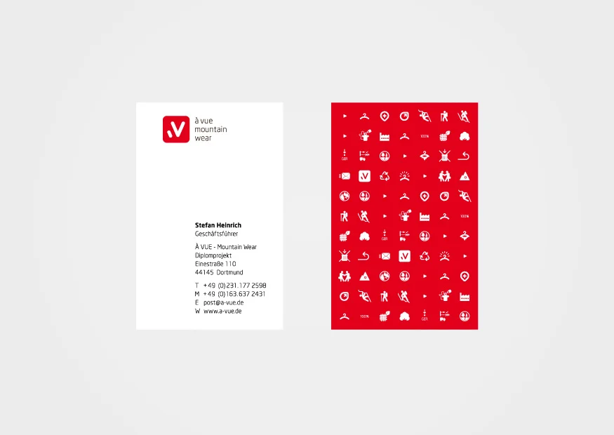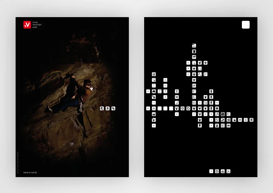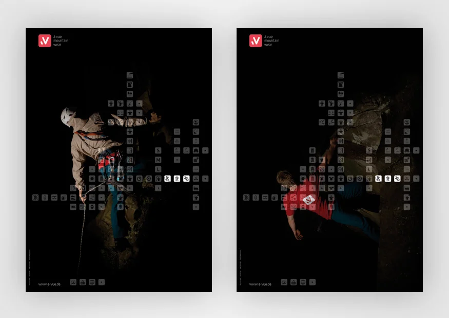 »À Vue« ist eine junge Bergsport-Marke, die modernes, anspruchsvolles Design mit den höchsten sozio-/ökol. Standards entwirft: faire Bezahlung und Behandlung der Angestellten und der Benutzung eines Minimums an ökologischer Chemie.