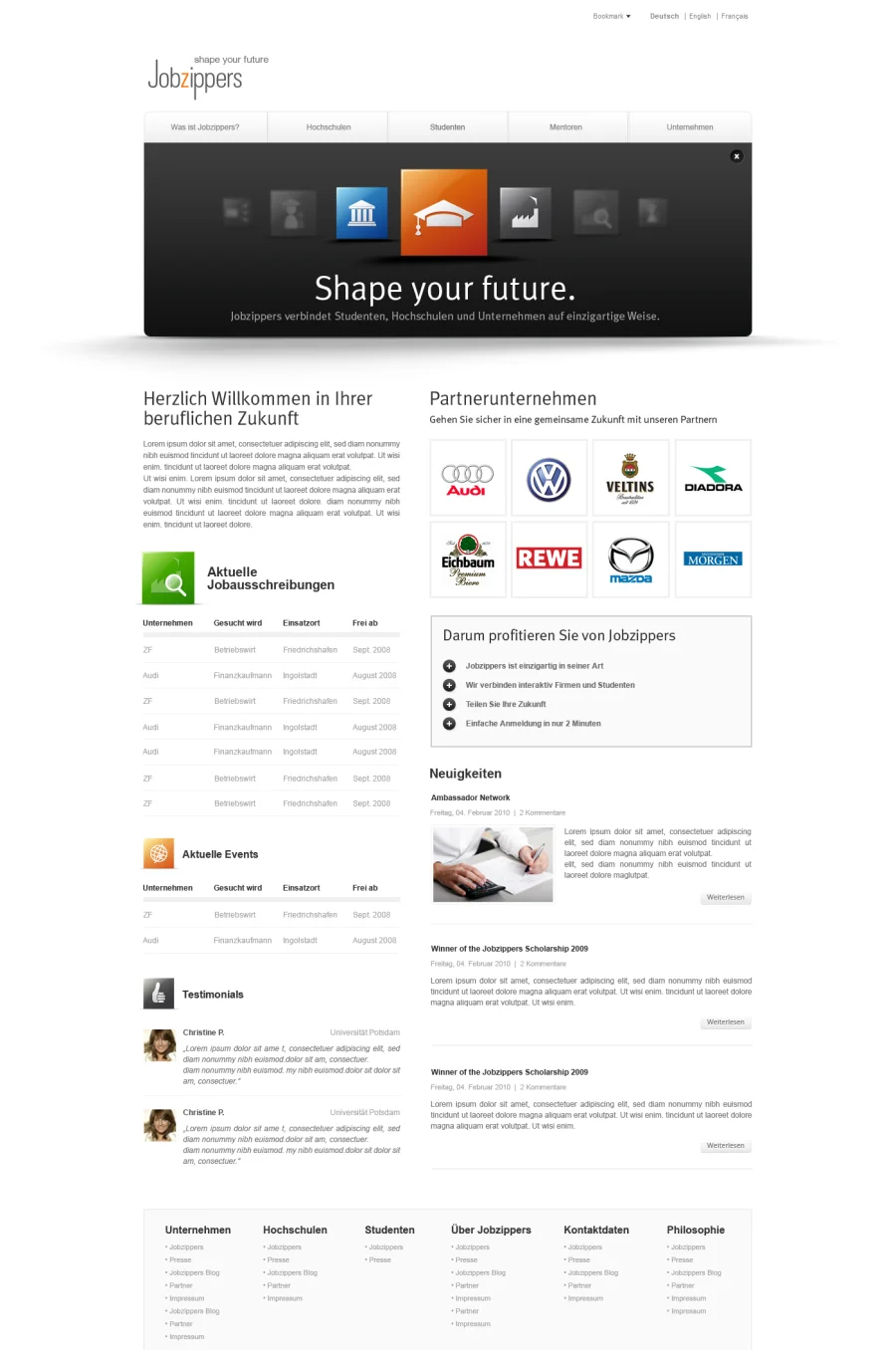 Wir – dieTaikonauten – begleiten Jobzippers gestalterisch seit der konzeptionellen Entwicklung ihrer Services und entwarfen dabei die visuelle Identität des Karrierenetzwerks. Aufgrund der unterschiedlichen Zielgruppen bestehend aus Unternehmen, Hochschulen und Studenten war es essentiell, dem Corporate Design klare Gestaltungslinien zu geben und bedeutende Inhalte direkt zuordenbar zu machen. Diese visuelle Klarheit macht das Logo zu einer einprägsamen Textmarke und verleiht dem Webdesign eine benutzerfreundliche Oberfläche. In diesem Zusammenhang legten wir auch großen Wert auf die Entwicklung eines individuellen Iconsets, das durch stringent konzipierte Gestaltungselemente und sattem Farbeinsatz eine deutliche Bildsprache spricht. Weiterführend entwarfen wir neben personalisierten Visitenkarten und Briefbögen auch entsprechende Werbe- und Informationsmaterialien zur effektiven Eigenpräsentation.