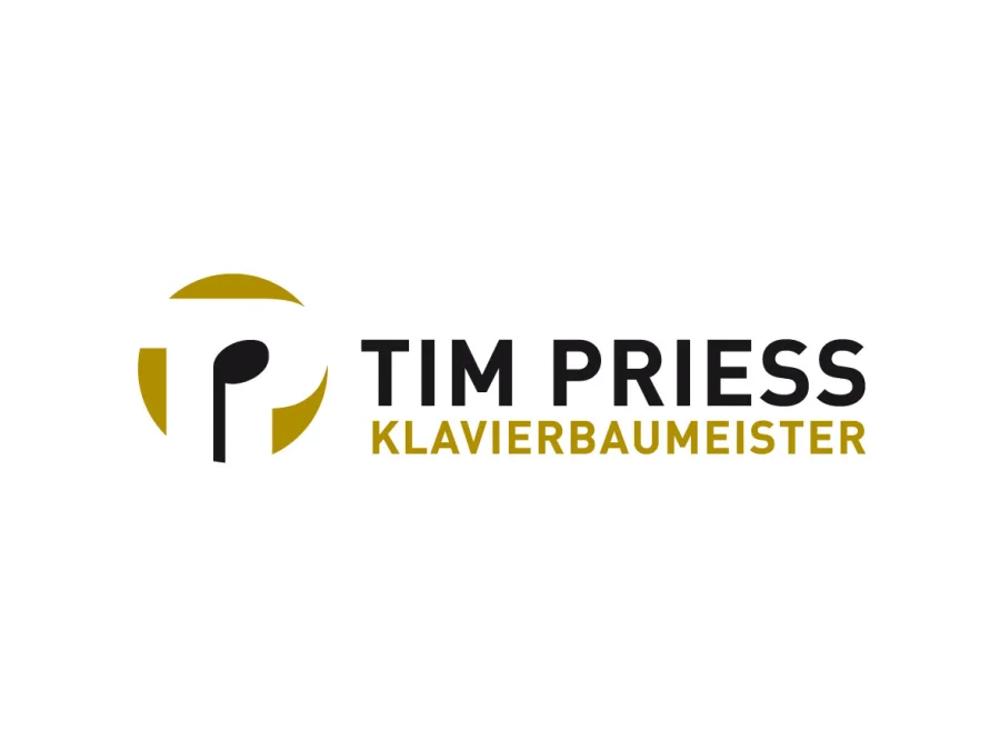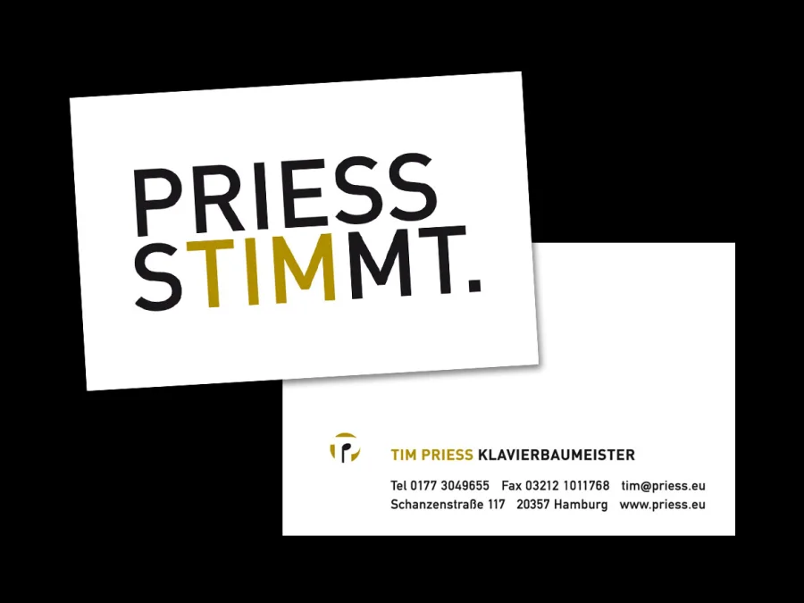 Der Klavierbaumeister Ihres Vertrauens stimmt Klaviere und heißt Tim Priess. Das erfährt man schnell in textlich sehr komprimierter Form auf der Vorderseite der Visitenkarte. Das Logo auf der Rückseite bildet die grafische Entsprechung – durch die Kombination der Initialen mit einer Note.