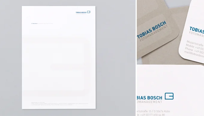 Die prägnante Bildmarke besteht aus abstrahierten Initialen und symbolisiert ein Pool, das alle umfangreichen Dienstleistungsangebote von TOBIAS BOSCH Fotomanagement beinhaltet.