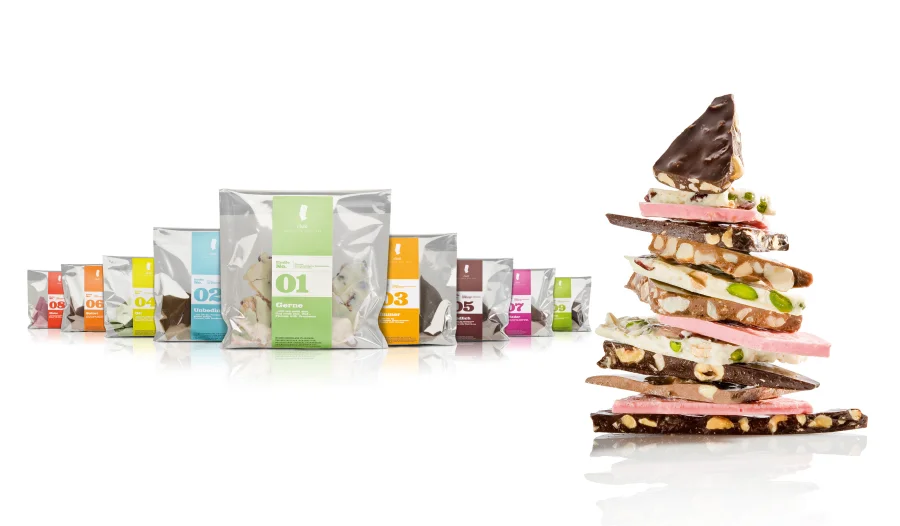 Produktentwicklung, Namensgebung und Packaging Design für 9 Sorten handgeschöpfter Schokolade. Und zusätzlich die weitere Verkaufsförderung und PoS-Kommunikation.
