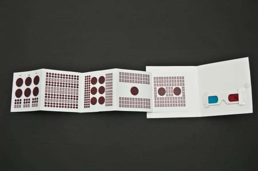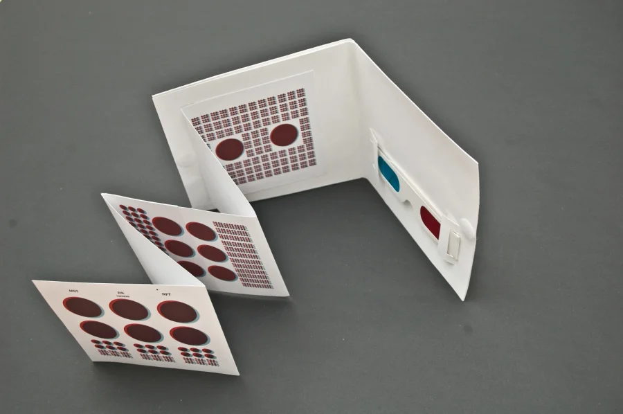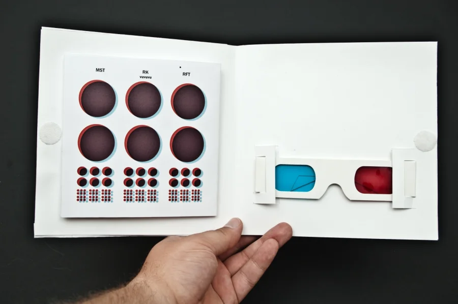 Um diese Tiefe und Wirkung darzustellen, basiert das Konzept auf Stereoskopie um so die Tiefe richtig zum Ausdruck zu Bringen. Außerdem beschränkt sich das Design auf die gestalterische Grundform des Kreises. Um dennoch Abwechslung zu zu schaffen, ist die Kreisgröße den einzelnen Tonspuren angepasst um so Lautstärke und Geschwindigkeit darzustellen. Um die für die Stereoskopie notwendige Rot/Blau-Brille vernünftig unterzubringen, ist die Verpackung für ein 7 Inch Vinyl angepasst.
