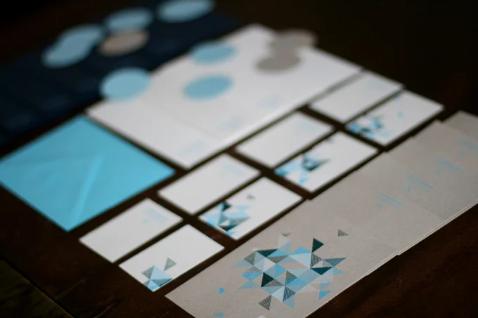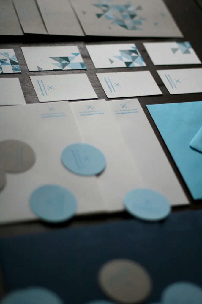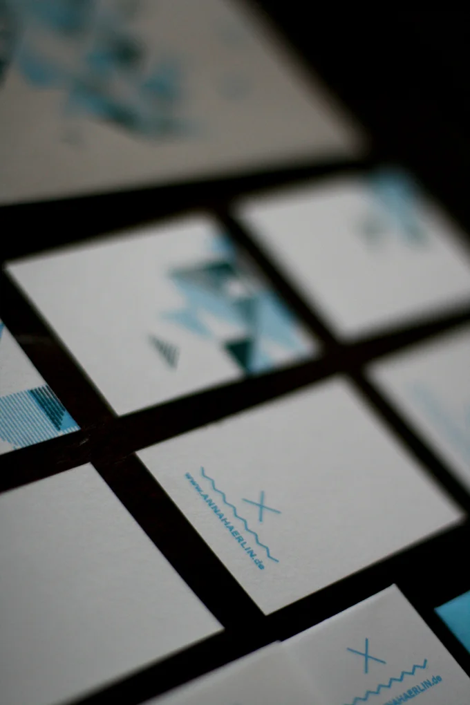 Meine Geschäftsausstattung habe ich in Kleinstauflage von 100 Stück handgedruckt – mit einer kleinen japanischen Maschine namens Gocco. Der Gocco-Druck ähnelt sehr dem Siebdruck. Für das geometrische Muster und meine www-Adresse auf der Rückseite habe ich 4 verschiedene Druckvorgänge durchgeführt.