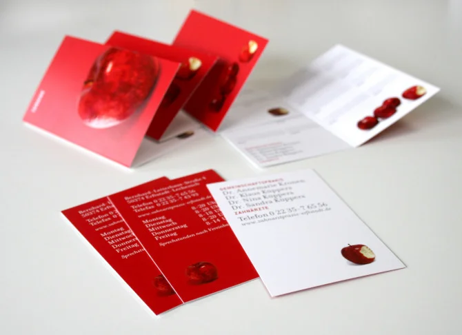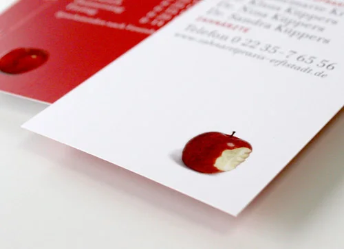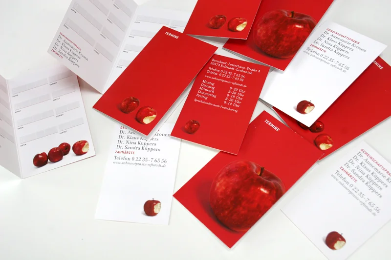 Variierende Visitenkarten und Terminzettel für eine Zahnarztpraxis. Partieller UV-Lack macht die Äpfel knackig.