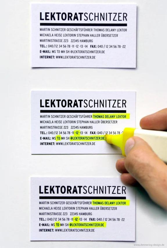 Besonderheit: Die Visitenkarte ist für alle Mitarbeiter gleich gedruckt. Die Unterschillichen Namen, Telefonnummern und E-Mailadressen werden durch „anstreichen” wie im Lekorat üblich herrausgestellt.