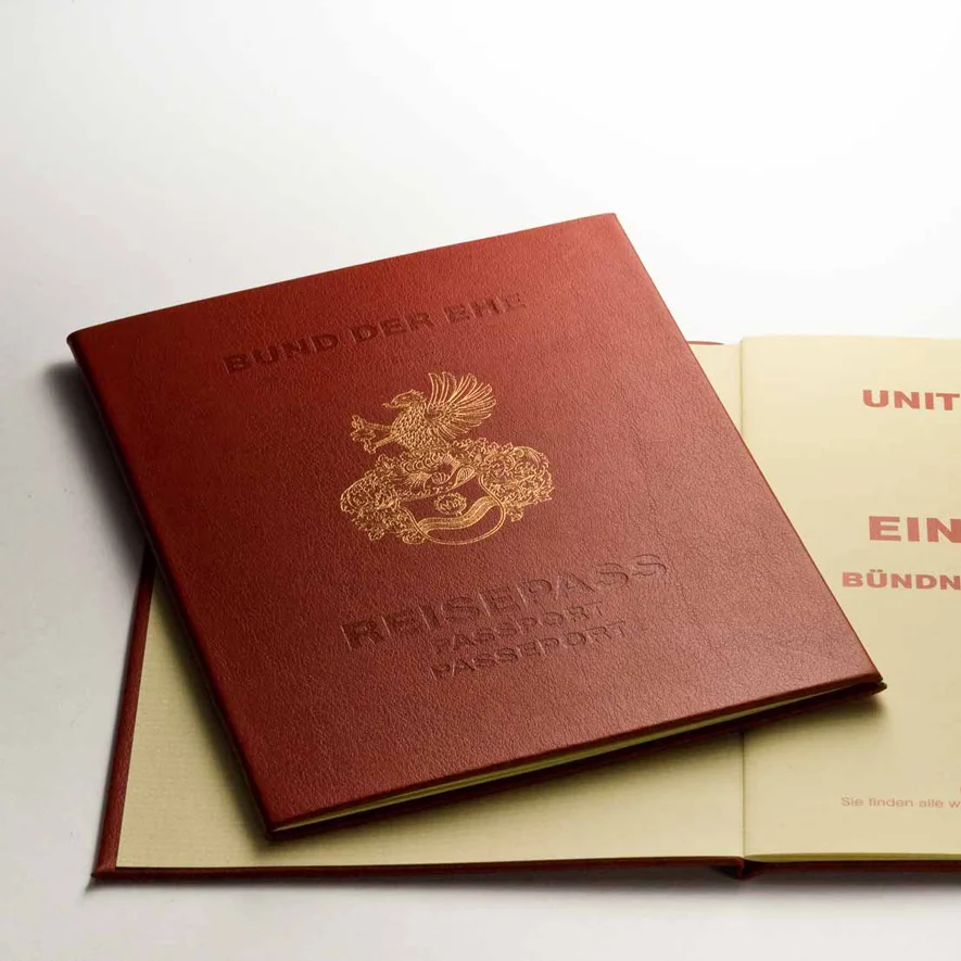 Die eigentliche Einladung ist das Prunkstück der Serie. Ein Reisepass informierte den Empfänger über die Eheschließung und die Details von Reise und Feier, ein Visumantrag fungierte als Rückantwort.