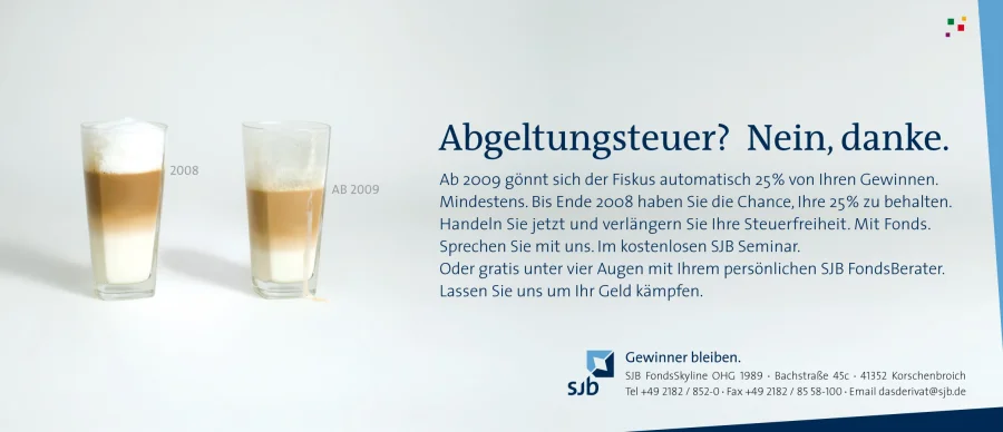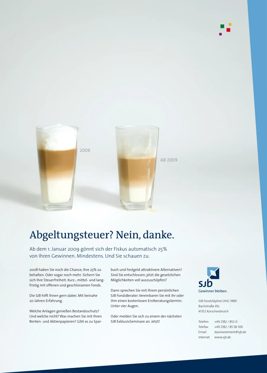 Die Aufgabe war es, für die SJB FondsSkyline 1989 OHG ein Anzeigenmotiv zu gestalten und zu shooten, welches das Thema Abgeltungsteuer und die Folgen für Kapitalanleger visuell verdeutlicht.