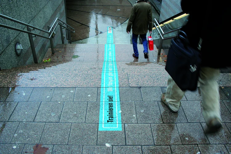 Mechanik: Um den Text zu lesen muß der Kunde die Treppenstufen hinuntergehen und erlebt so wie einfach Sport sein kann und hat damit sein erstes Erfolgserlebnis