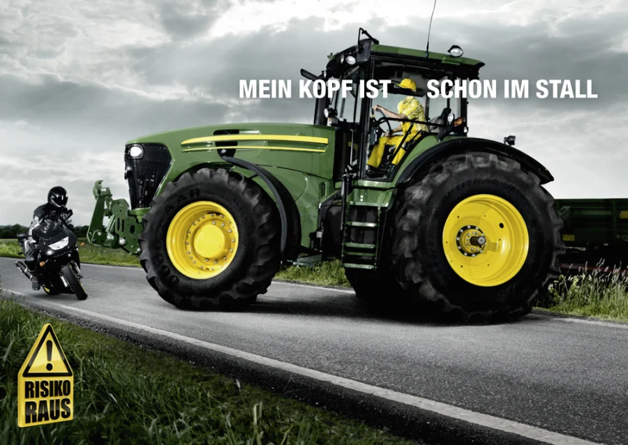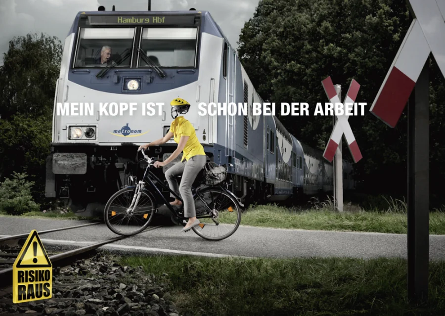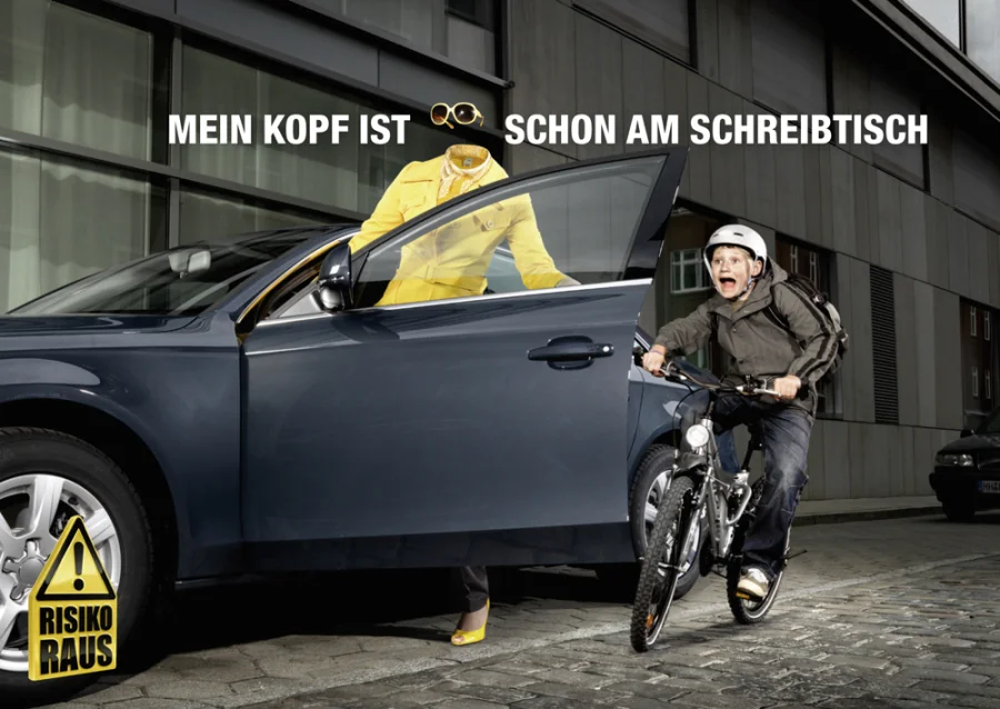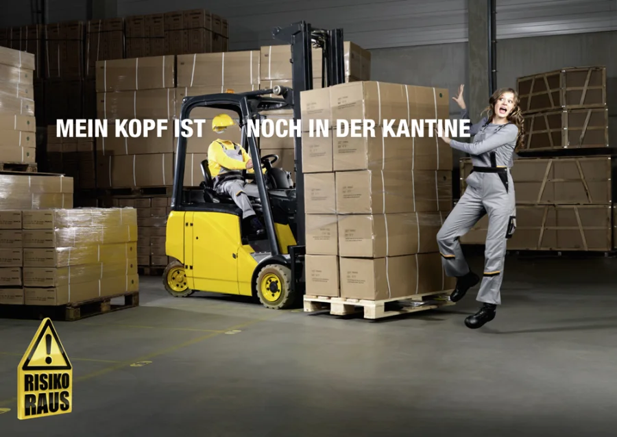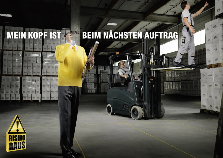 Mit bisher 10 zielgruppenspezifischen Motiven, die „kopflose“ Menschen kurz vor einer typischen Unfallsituation zeigen, möchte die gesetzliche Unfallversicherung für mehr Risikowahrnehmung bei der Arbeit und im Straßenverkehr plädieren. Es wird auf eindringliche Weise dargestellt, wie eigenes Fehlverhalten zur zentralen Unfallursache werden kann.