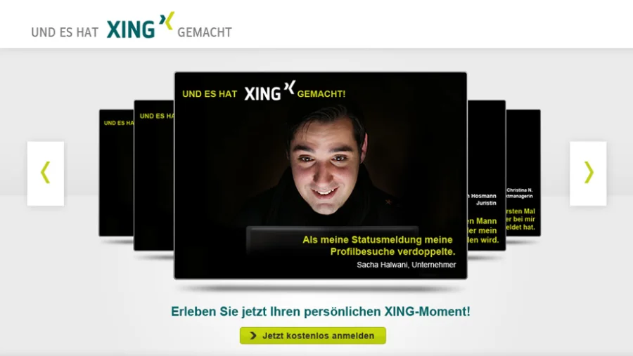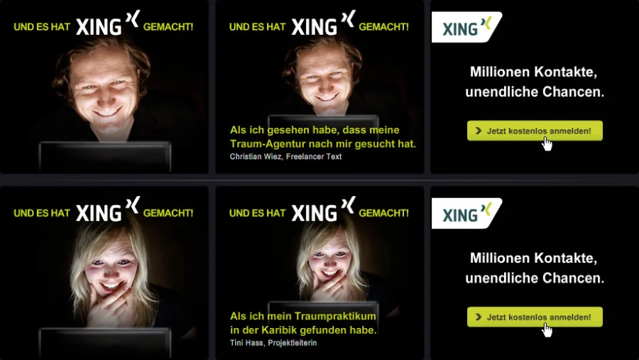 Unter dem Motto „Und es hat XING gemacht“ sind Menschen zu sehen, in deren Gesichtern sich die Reaktion auf ihren persönlichen XING-Moment spiegelt: die erste Mail vom Headhunter, das 1000. Mitglied in der eigenen Expertengruppe, ein neuer Job.