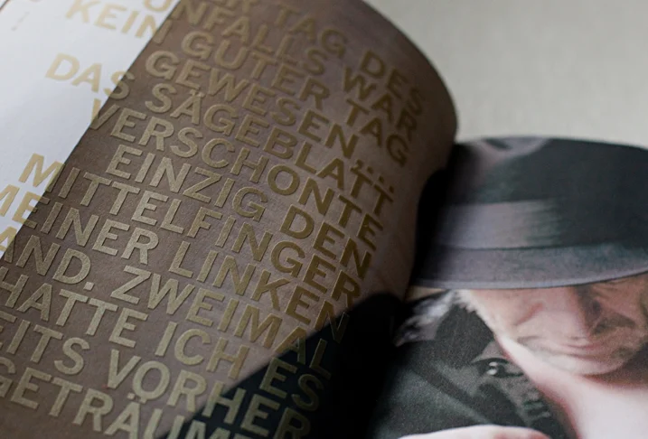 Damit das Buch auch für die Hände ein Erlebnis wird, habe ich diese Veredelungstechniken eingesetzt : Goldene und transparente Buchstaben, einen weichen Ledereinband mit eingesticktem Titel und warmes Naturpapier.