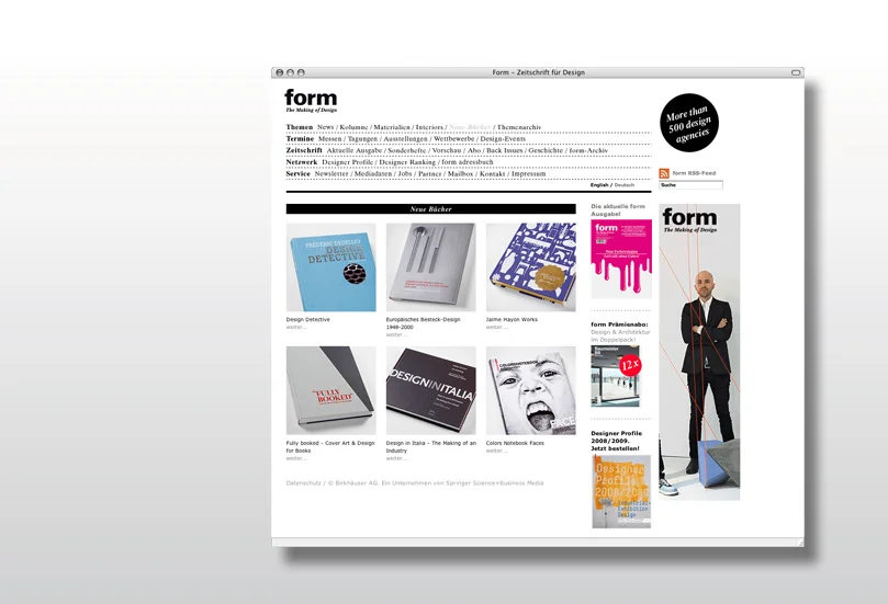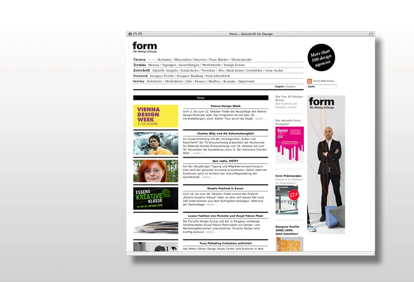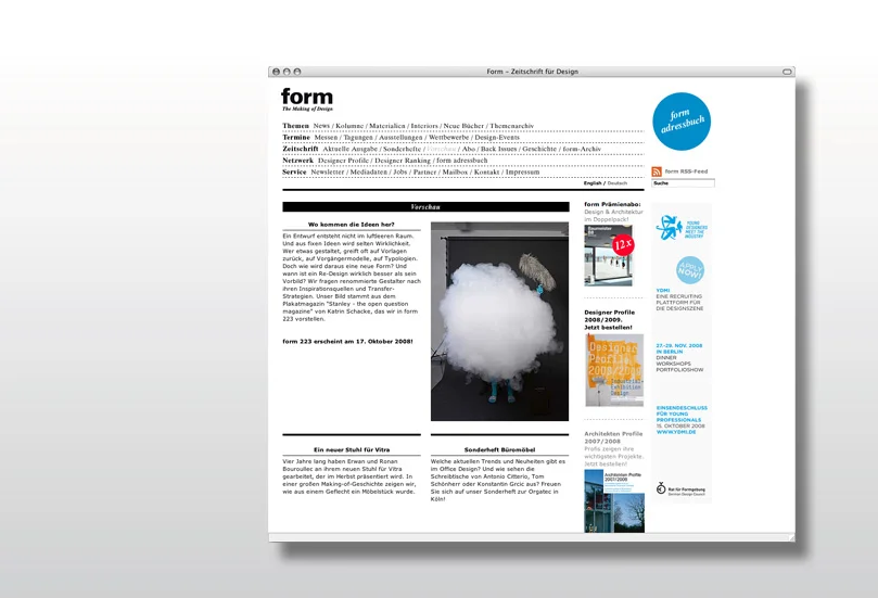 der von uns entwickelte webauftritt von deutschlands wichtigster designzeitschrift kombiniert aktuelle designelemente mit „form-typischer“ strenge. die navigation stellt sämtliche inhalte auf einen blick zur verfügung, und die signifikante strukturierung des layouts ermöglicht es dem user, schnell und unkompliziert durch eine vielzahl von artikeln zu navigieren.