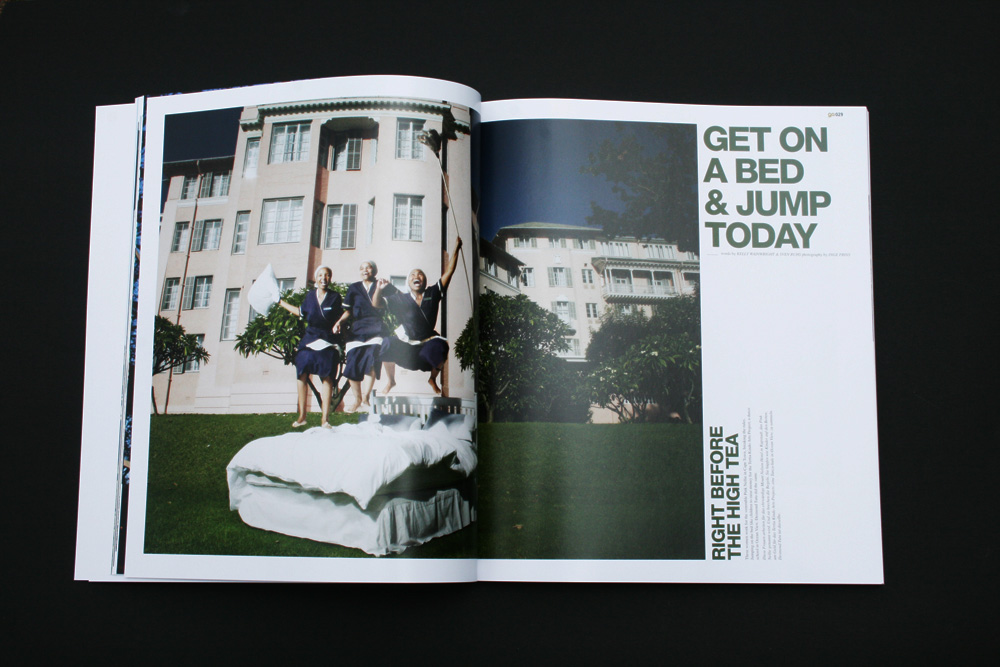 Aber das eigentlich besondere an „Golden Arrow“ ist, dass das Magazin komplett ohne Werbung auskommt und dadurch der Eindruck eines der gängigen, unzähligen Lifestyle/Reise/Mode/Beauty/Shopping-Magazine vermieden wird. Im Gegenteil nimmt sich die Gestaltung dezent zurück, setzt einzelne grafische Highlights und lässt dem Inhalt den Freiraum der ihm zusteht. Denn darum geht es: Das Land als ein ganzes vorzustellen, mit all seiner Vielfalt und Möglichkeiten. Seinen Ecken und Kanten und seinen unzähligen Facetten und Gesichtern.