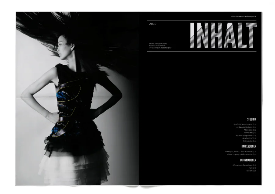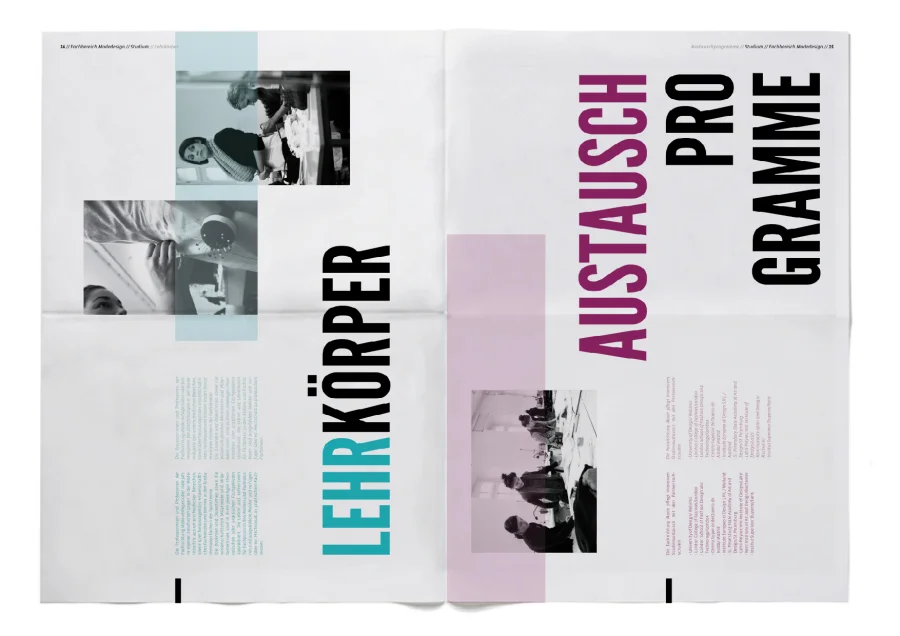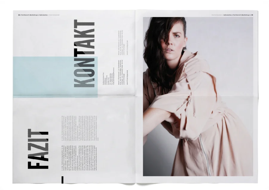 Im Rahmen einer Semesterarbeit ist diese Informationsbroschüre für den FB Modedesign entstanden. Die Broschüre ist in einem A3 Zeitungsformat gestaltet und auf Zeitungspapier gedruckt. Hier einige Auszüge.