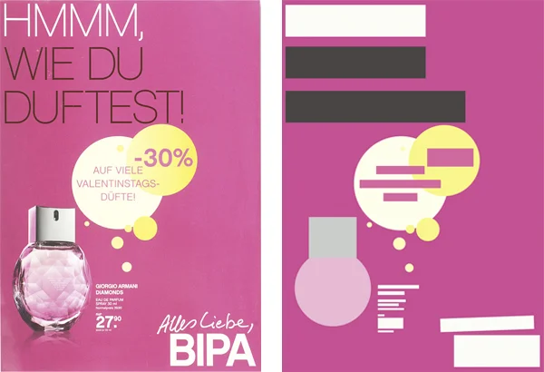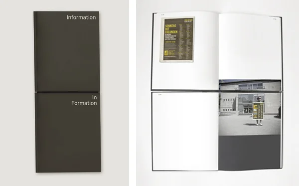 Ich habe für dieses Buch zwei Monate lang gedruckte Information in Form von Postwurfsendungen, Zeitschriften, Flyer und Zeitungen gesammelt und mit geometrischen Formen nachgebaut. Die Schrift wurde durch Rechtecke in der entsprechenden Farbe anonymisiert und Gestaltungselemente so weit wie möglich abstrahiert. Das Ergebnis der Abstraktion sind Plakate, die ohne spezifische Information auskommen. Manche Kompositionen sind jedoch – trotz des Verlustes an Information – lesbar und zuordenbar, andere bleiben wiederum unerkannt. Die Fotos nehmen Bezug zu den Plakaten und helfen dem Betrachter bei der Auflösung der Rätsel.