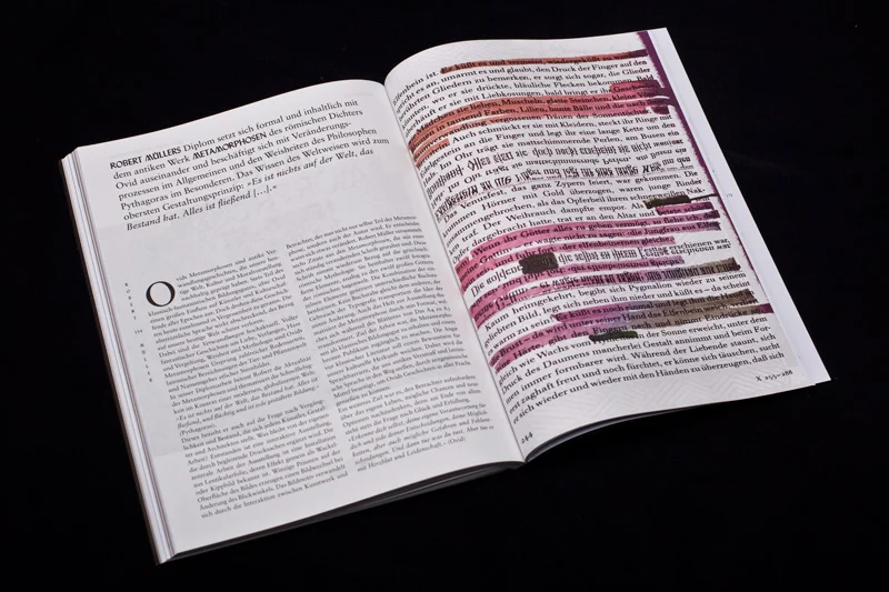 Veröffentlicht werden ausgewählte Projekte, Diplome und Arbeiten. Die Redaktion und Gestaltung des jährlich erscheinenden Magazins liegt komplett in studentischer Hand.
