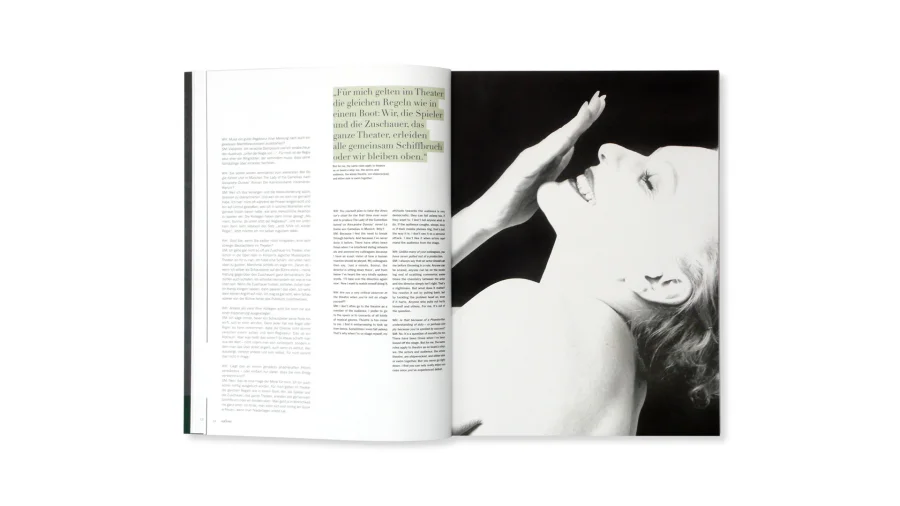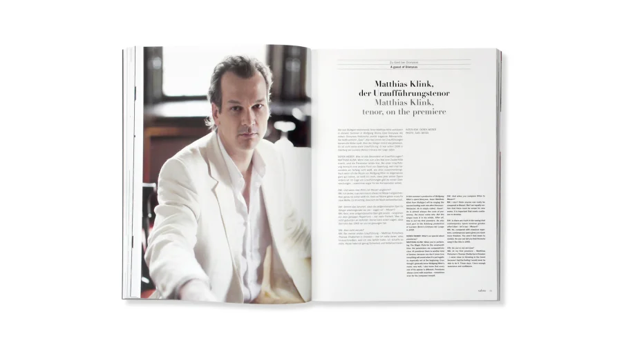 Das zweisprachige Layout des Magazins, der spielerische Umgang mit Typografie und die großzügigen Abbildungen spiegeln den Reichtum und die Vielfältigkeit der Veranstaltungen wider. In Leitartikeln, Essays und Kommentaren werden Künstlern, Musikern, Schriftstellern und Fotografen mit deren Gedanken zu dem Festspielmotto „Wo Gott und Mensch zusammenstoßen, entsteht Tragödie“ vorgestellt.