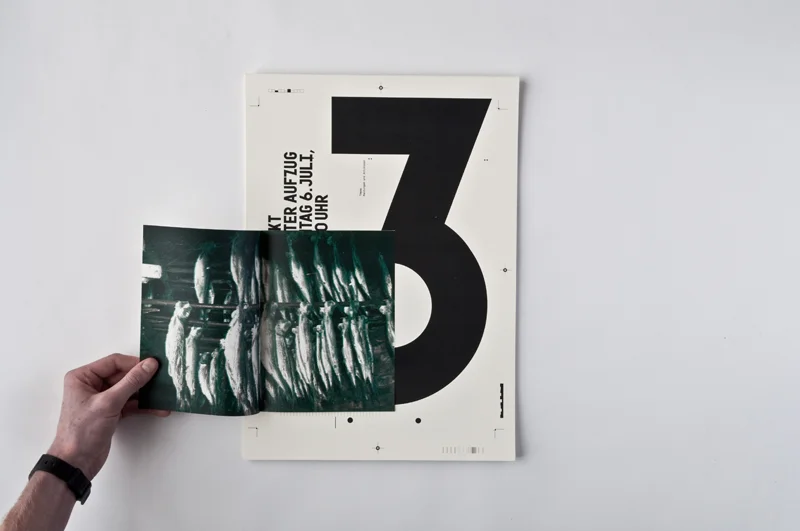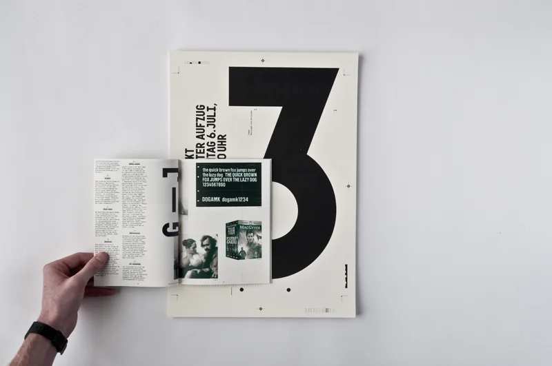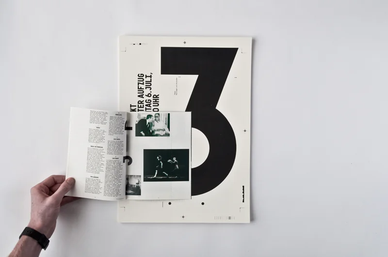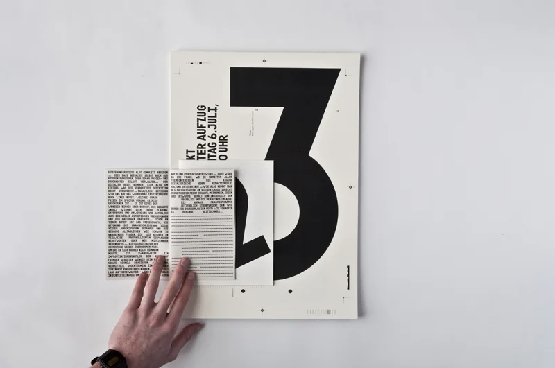 We analyzed „liner notes“, chose the chapters „typography“ and „attitudes“ and split this present data aside to new generated material by us into three simultaneously readable „acts“. We built „stages“ for the content, included theater-like breaks for the reader, commented inside the script by hand and found other play-inspirated ways to deal with text and image.