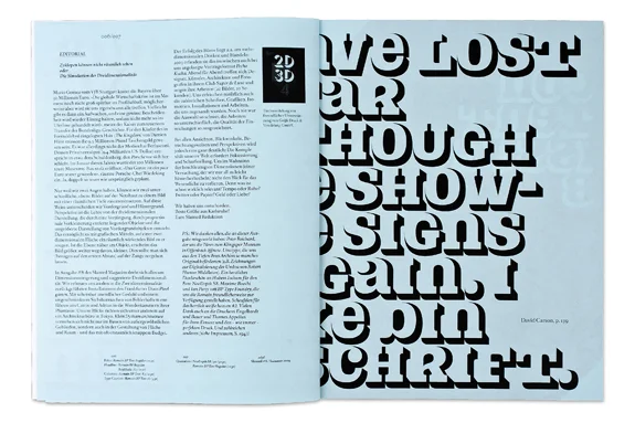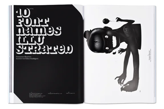 Die Kapitelseiten schmücken die von Hubert Jocham exklusiv für diese Ausgabe gestaltete Headlineschrift “NeoDepth S8”, welche die Leser dieser Ausgabe kostenlos zum Download erhalten. Der Einband ist mit einem Poster umhüllt – das Zweite aus einer Serie von vier Plakaten, die am Ende des Jahres zusammen einen Satz bilden werden. PORN (#7) war der Anfang, mit 4 (#8) geht es weiter … Da wir der Meinung sind, dass nach der Dimensionssteigerung von 2 auf 3 – 4 folgen muss.