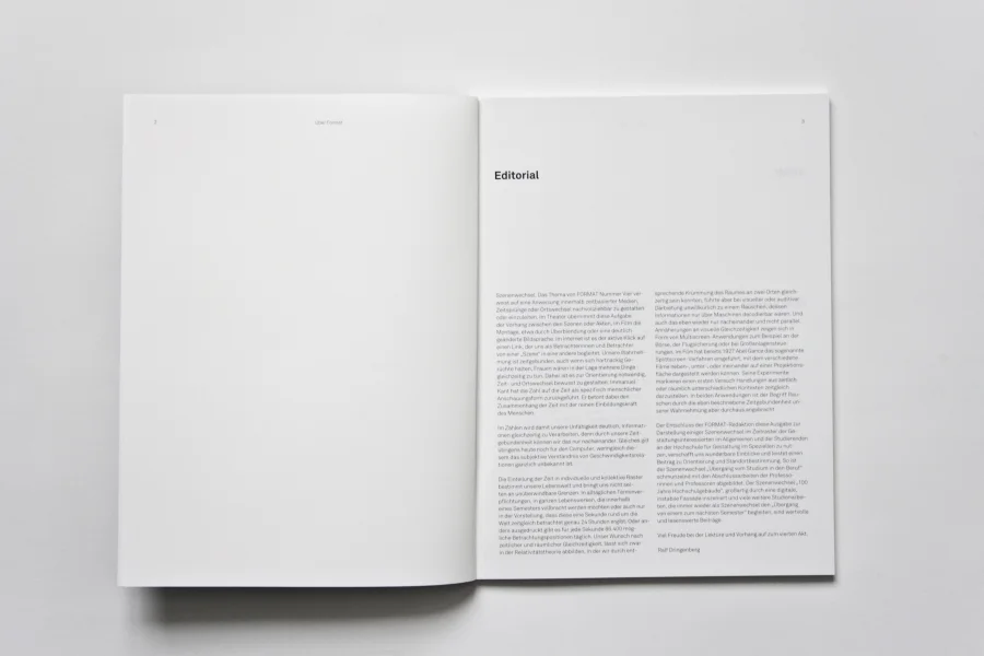 Heft Nummer Vier der FORMAT beschäftigt sich mit einigen Szenenwechsel im Kontext der Gestaltungsinteressierten und der Studierenden der Hochschule für Gestaltung Schwäbisch Gmünd. Der Wechsel „Übergang vom Studium in den Beruf” mit Abschlussarbeiten von Professorinnen und Professoren, „100 Jahre Hochschulgebäude” inszeniert durch eine abwechslungsreiche Fassadenbespielung, und natürlich viele Studienarbeiten, die als Szenenwechsel den „Übergang von einem zum nächsten Semester” begleiten.
