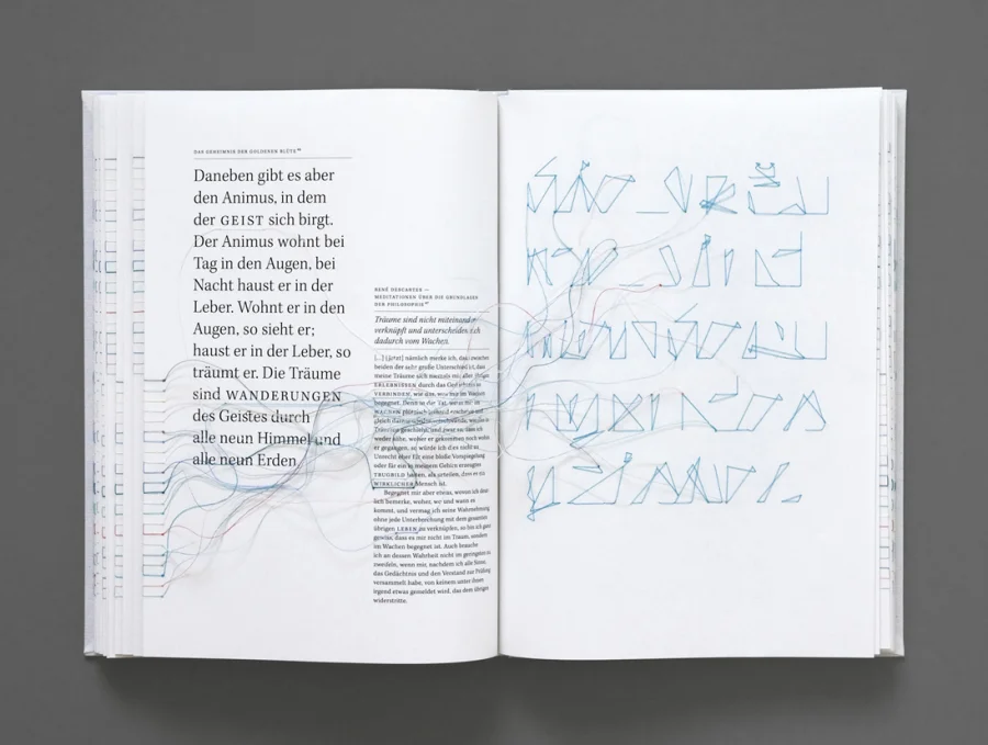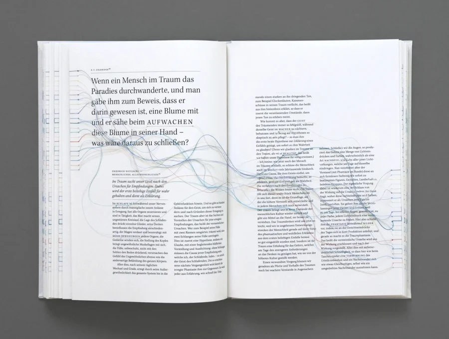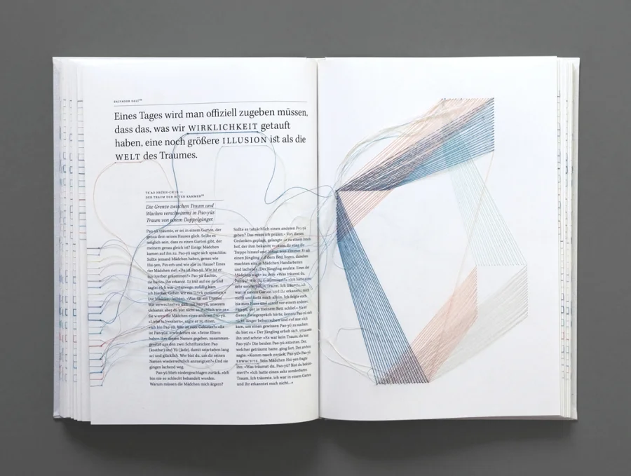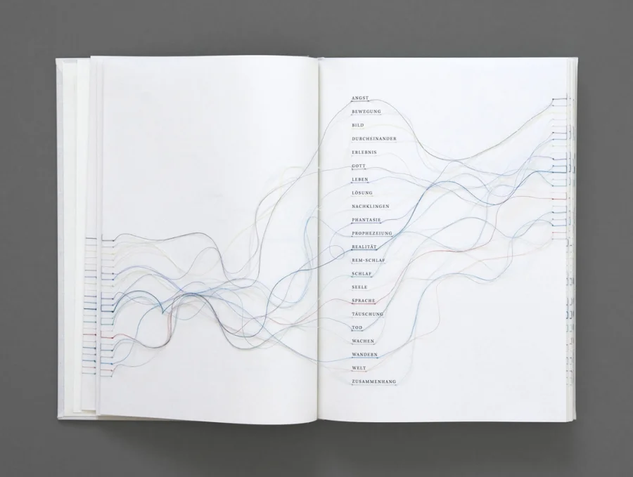 Um den Zugang zu dem schwer fassbaren Thema zu erleichtern, ist das Buch als Modell eines Traums vom Träumen konzipiert. Analog zu einem Traum, in dem Bruchstücke aus der Wirklichkeit zu einer Handlung zusammengefügt werden, treffen darin unterschiedliche Textauszüge aufeinander. Diese sind durch Fäden, die an Schlüsselwörter anknüpfen, vernetzt. Die Fäden visualisieren die Verworrenheit und die Zerbrechlichkeit der Träume.