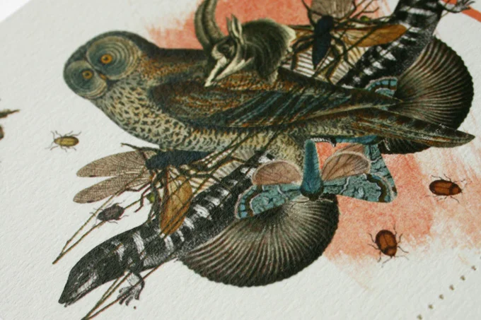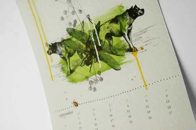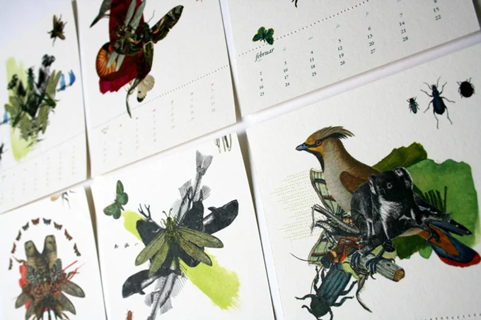 12 Collagen aus antiken Tierzeichnungen mit eigenen Illustrationen habe ich zu Kalenderblättern gestaltet, die in einer aufklappbaren CD-Hülle stecken. Die Angaben zum Monat kann man durch einen perforierten Rand abreißen und die Collage als Karte verwenden.
