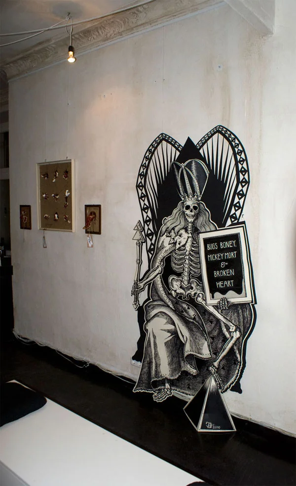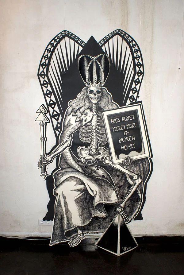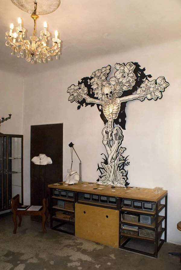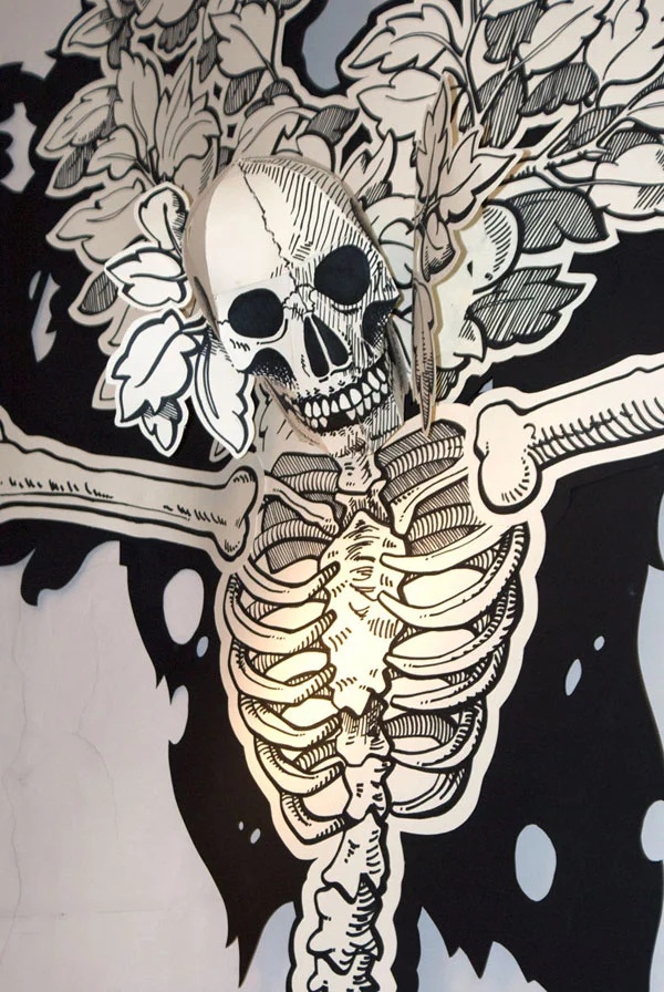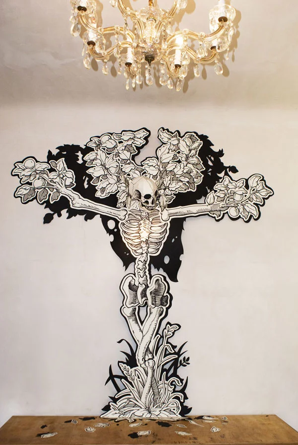 Leftovers sind in Serie illustrative, großformatige 2 1/2d Handzeichungen mit Cutoutelementen. Jeweils exklusiv für die entsprechenden Events und deren Räume entworfen sind sie ca. 2m hoch. Die Serie befindet sich im Aufbau und kann nur in Bezugnahme auf interessante Räumlichkeiten weiterwachsen.