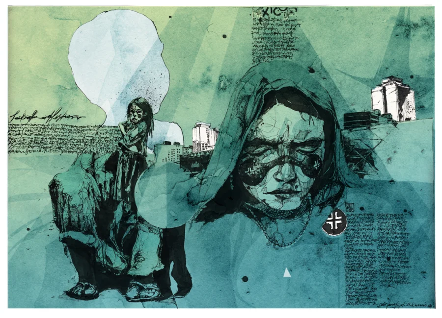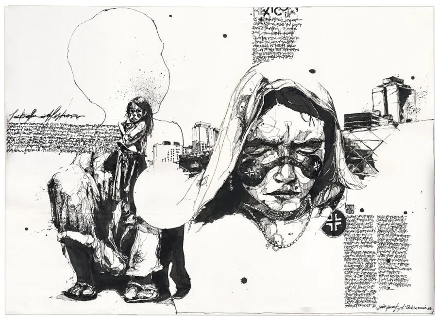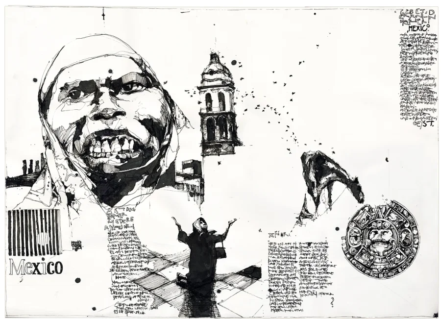 Im Rahmen des Studiums entstanden diese großformatige Zeichnungen, die die Geschichte, Kultur und Religion in Mexico aufgreifen und sie einander gegenüberstellen.