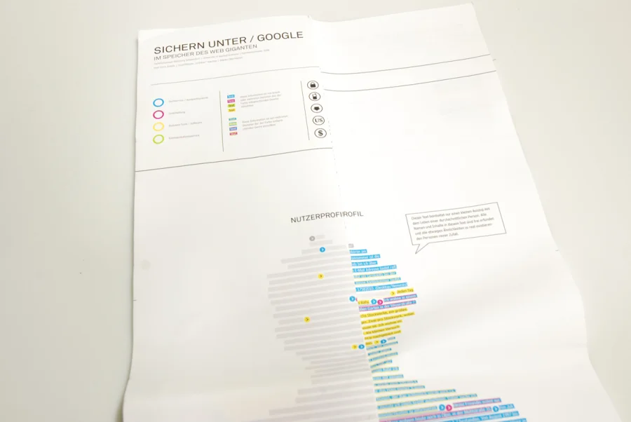 Die Vorderseite zeigt einen durchschnittlichen Nutzer und welche Google-Dienste jeweils Daten über ihn sammeln und interpretieren.