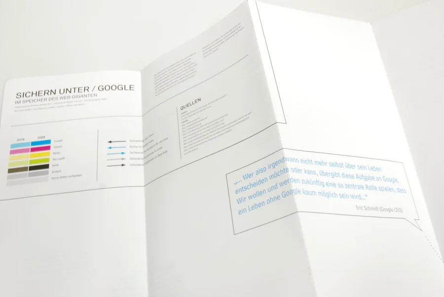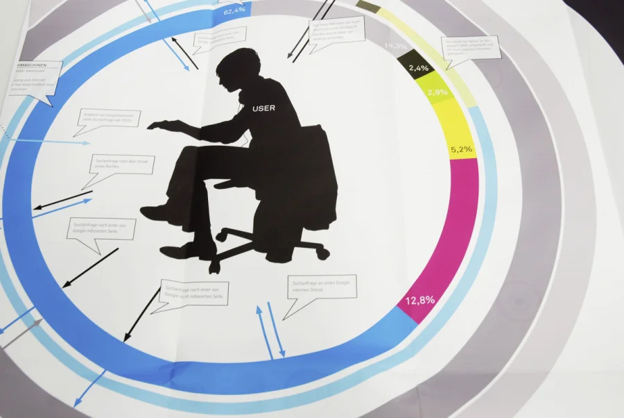 Die Grafik auf der Rückseite stellt die Funktionsweise einer Suchmaschine vereinfacht dar. Außerdem wird ersichtlich, welche Machtstellung die Suchmaschinen durch ihr Informationsmonopol inzwischen innehaben. Die Grafik zeigt zudem den Marktanteil der einzelnen Suchmaschinen auf der ganzen Welt und wagt einen Ausblick auf die Entwicklung in der Zukunft.